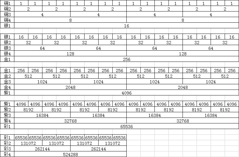 游戏也玩了一段时间了,虽然算不得大佬,但勉强也算脱离萌新阶段了,现整理一下游戏里角色合成的部分数据,分享给大家,希望能帮到刚入坑的伙伴。 游戏合成规则为两个同星级的角色可以合成一个高一级星级的角色,例如两个铜1星可以合成一个铜2星,两个铜2星角色则可以合成一个铜3星角色,以此类推。目前下表统计到彩色4星,而游戏自行刷新的角色只有铜1星,想要合成到彩色4星则需要524288个铜1星角色(具体可以看下
