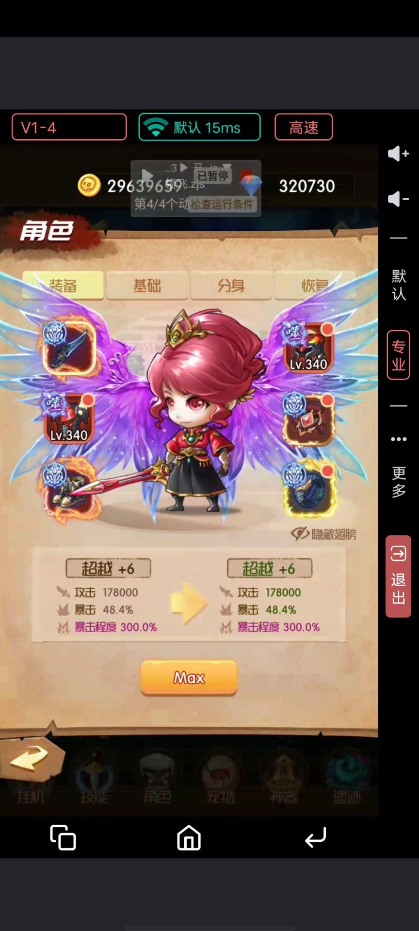 在说游戏玩法和攻略的时候,咱们先了解一下游戏里面基本的恢复,分身,基础,3个能力。 第1个是恢复属性,恢复是每隔一段时间给一个小兵,满级恢复,间隔是5.5秒一个小兵, 第2种是分身属性,分身的数量,是限制恢复的,战斗界面那个max就是到恢复上限的意思,比如你的分身数量是5个,你阵容里也有5个兵,那么恢复就会失效,并且显示max,就算你把阵容里的兵放仓库里面,分身一样限制恢复,但是离线恢复就不受分身