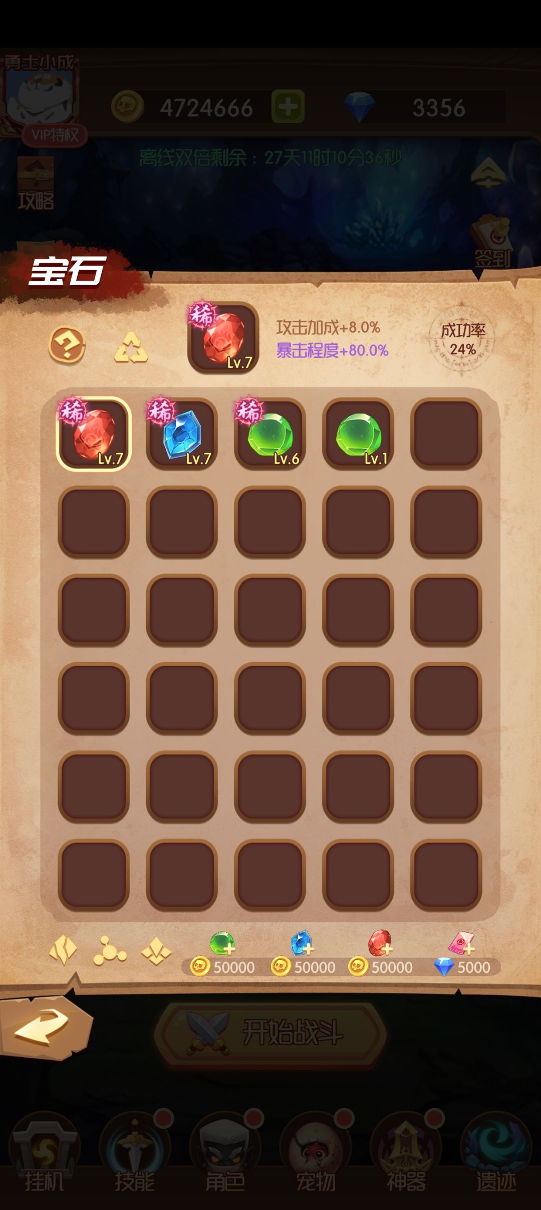 钻石篇💎 前期钻石不要抽宝箱,钻石优先升级装备,装备满级340级,大约26万钻石 装备满级后建议做神器,商店有1500钻20神器碎片每天能买三次,能买多少就是多少,广告还有15个碎片。 金币篇💰 根据个人玩法各有不同 想离线挂机每天上几次线收收菜的,建议把恢复先点满。 主打一个强度冲关的,优先点装备,基础,技能,这三项。 技能篇🗡️ 只需要升攻击加成,防御加成,回血,以及冲击波(打世界boss用攻