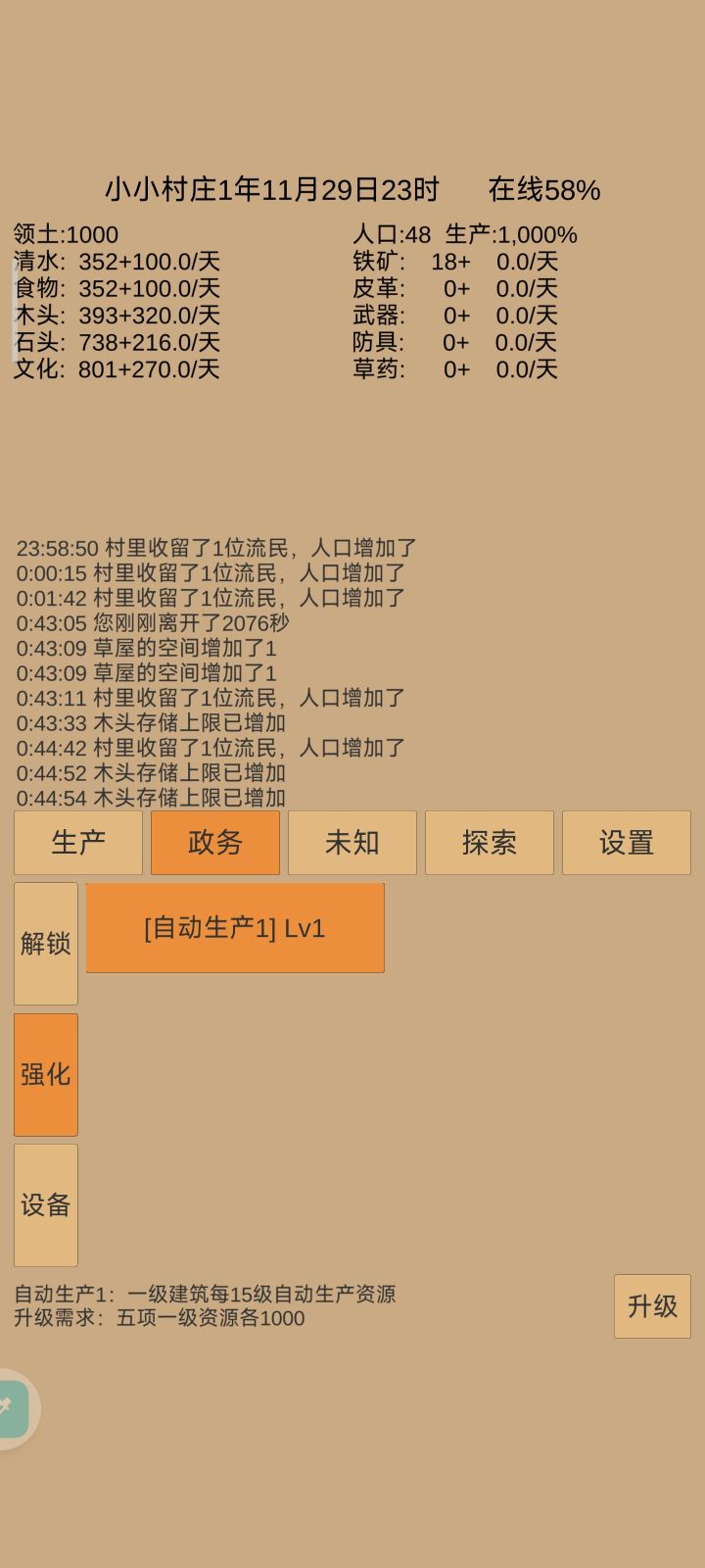 昨晚无聊翻小小城邦论坛发现别人说的这游戏,因为开局有10倍生产加速而且我不清楚下线这个十倍加速的时间是不是也算在内所以玩起来有点肝。不过玩了一天刚又暴了一波兵打领地导致现在生产速度降了很多。 而且感觉后面除了4阶段的生产建筑应该没有别的新玩法了,而且猜测4阶段也没有新玩法吧,就是压数值。不过作者2个月自学成才能做成这样已经很不多了,也希望作者不要放弃继续更新开发点新玩法👍