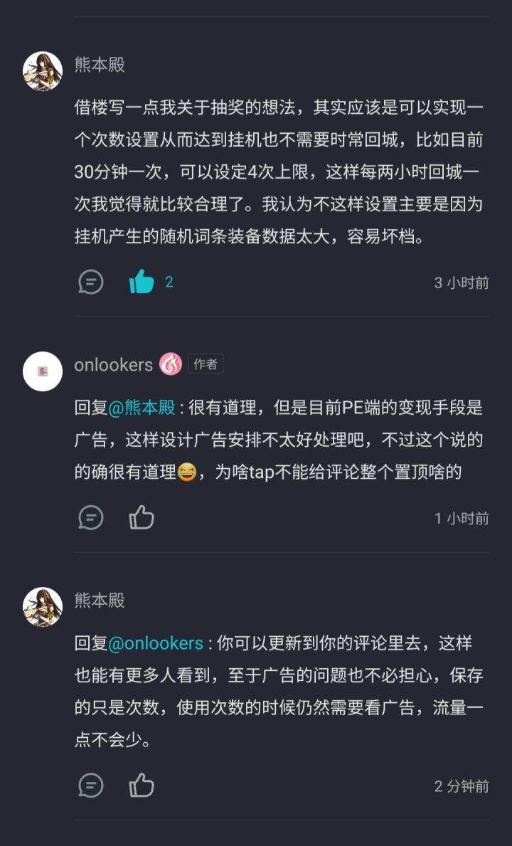 挂机机制的出现也表明了制作组想要降低玩家的无用游玩时常,尽量将新鲜感和长久的成就反馈保持在一个高水平上,但很明显这个设计在PE端上目前就是还存在问题,尽量能接近PC端操作就好,如果非要说我的建议把这款游戏变成了一个放置游戏,那不是打PC端的脸吗😂😂