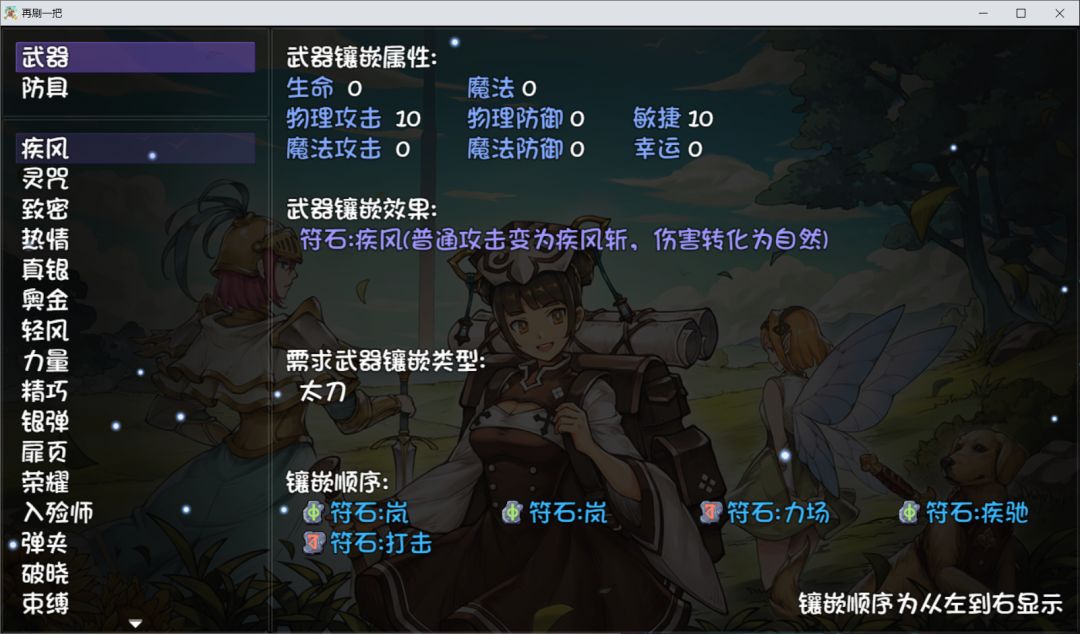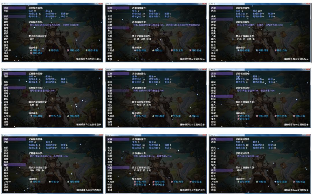 辅助减益类: (匕首.剑4孔)毁灭+真实+真实+狂攻=黯灭:破甲75点物防3回合(值得一说的是这个打法送的攻击有60点!) (钝器.杖.书8孔)灵韵+技巧+曜日+虚幻+虚幻+毁灭+精准+真实=施咒:开局使敌人暴击-5%,所有属性-100,持续到战斗结束.(我通常给奶妈打或者辅助法系打这个) (匕首.太刀.暗器5孔)胧+增强+技巧+岚+打击=致残:造成伤害有30%几率使目标暴击-10%,敏捷-50,