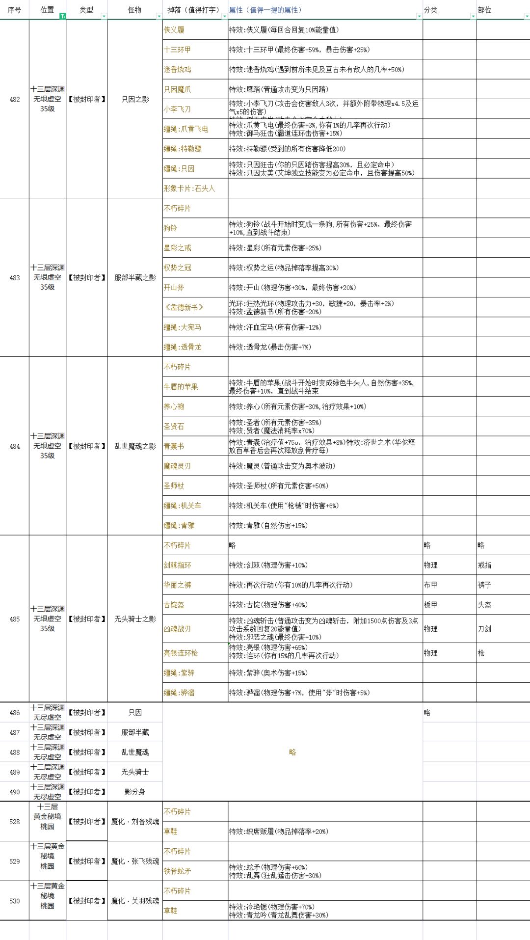 一、普通深渊 1.牛魔王(只有本体才掉落坐骑) 2.怒目金刚 3.太古魔魂 4.乱世邪魔 5.周傲天 6.猩红史莱姆 7.歼敌二号 二、黄金秘境 定军山:夏侯渊 黄忠 麦城:吕蒙 关羽 长坂坡:张飞 夏侯杰 上方谷:司马懿 诸葛亮 逍遥津:张辽 孙权