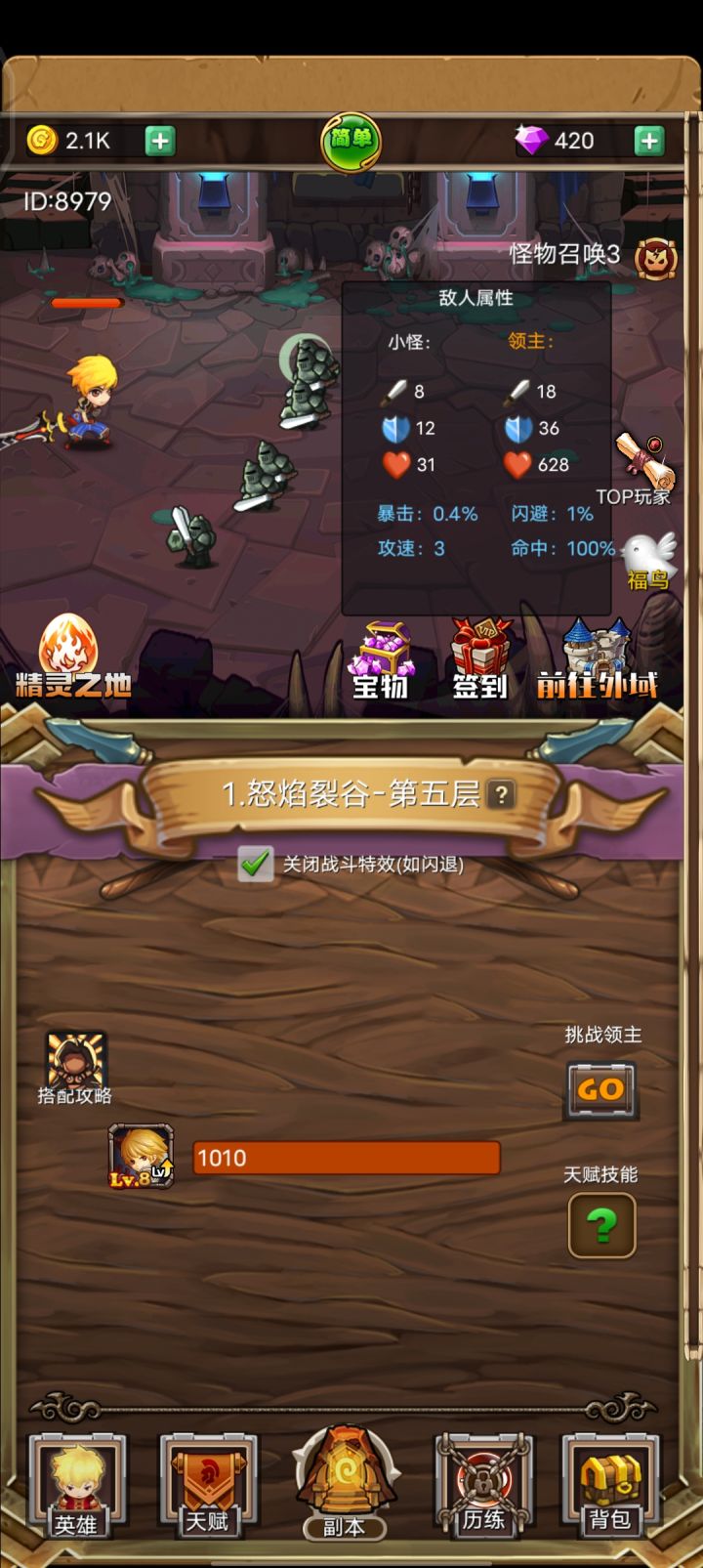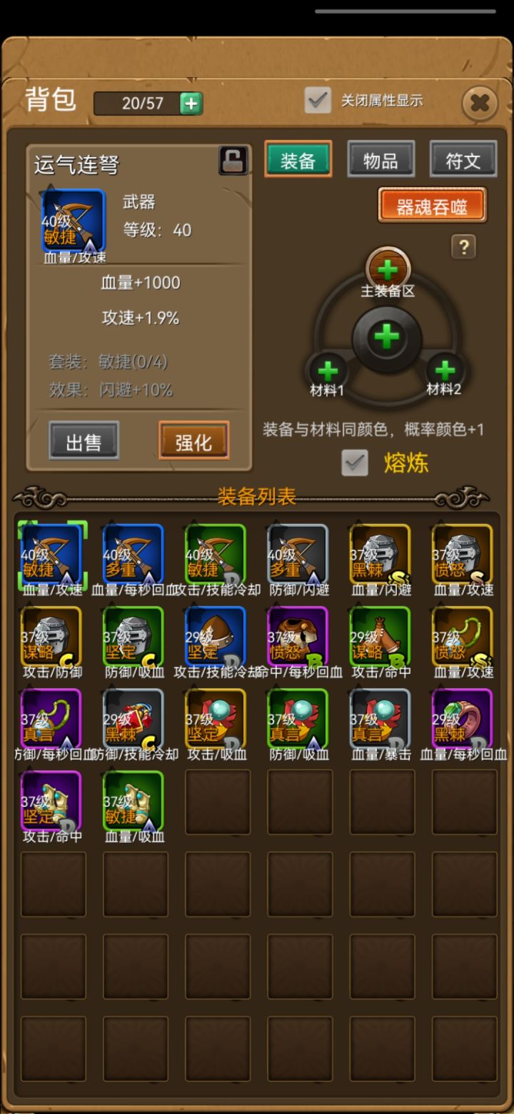 游戏总体不错,英雄选择丰富,装备的属性很有意思,熔炼装备可以升级装备的颜色及等级,多种属性可以选择。基本白嫖,没有花钱的地方,看广告奖励丰富