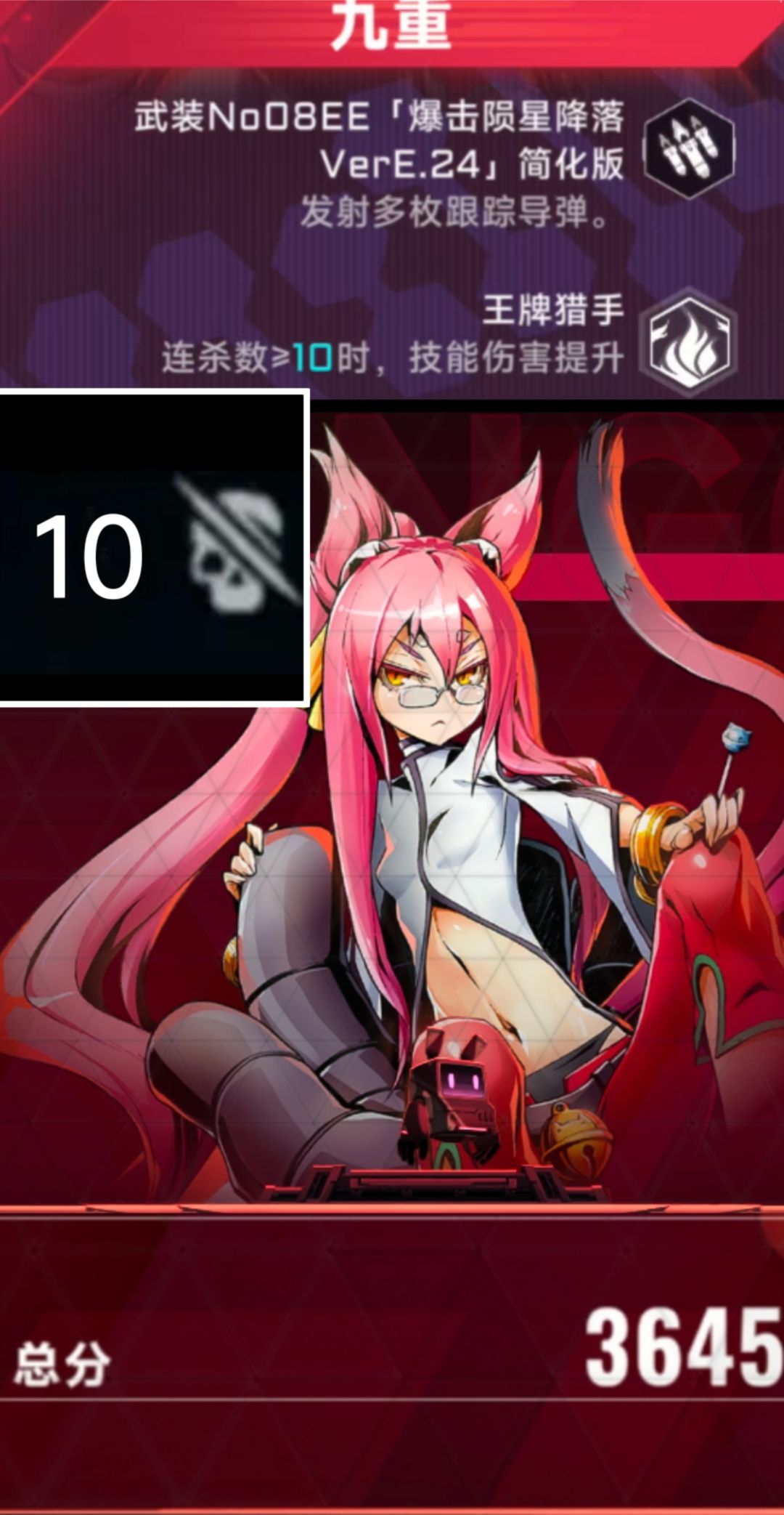 九重 主动:武装No.O8EE【爆击陨星降落VerE.24】简化版。 发射多枚跟踪导弹。 伤害还行,防空效果较好。 被动:王牌猎手 连杀数≥10时,技能伤害提升。 对技能有九成的加算伤害,提升可观。 (PS:伤害不可叠加。) #吃瓜爆料 #浅评一下 #游戏安利 #游戏推荐 #游戏讨论 #游戏资讯 #苍翼混沌效应