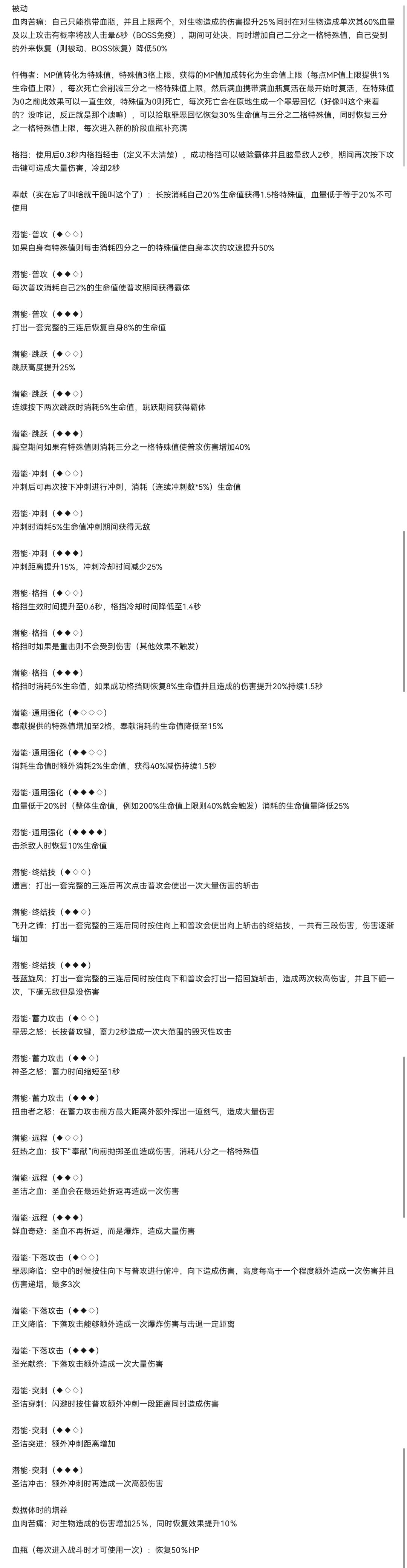 我觉得强度还可以,因为基本操作还是原版的,没二段跳也没多段冲刺,冲刺还有一点内置CD(感觉大概1.5秒左右?),放苍翼里面和其他的一比跟个残疾人一样那就只能玩玩机制了() 之前发现有一堆东西有点问题所以把最开始的那个帖子给删了 我想了想基础属性的话应该是160攻1000血(100%)这样应该还可以? 然后进入下一阶段的动作我想的是神之亵渎里面的等待动作,头盔里面渗出血然后擦一下 主要想到可能能把这