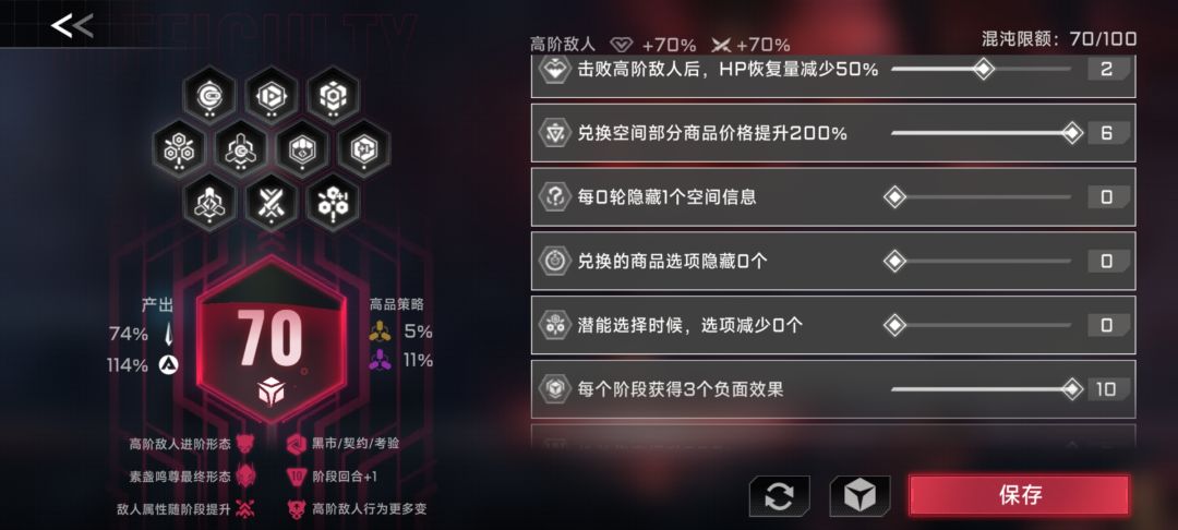 图中这仨不动,其他随意,最高可调至80混沌值,这仨要动了就玩的很便秘了。联机老是遇到隐藏房间,潜能减少的调法,难受的一批。 进阶75,80都玩的很舒服 超限看个人了,我喜欢70 小怪太肉可以把小怪生命值搞低一点,前期过渡舒服点 还有,开局商店买无伤奖励和速通奖励,不愁没钱买潜能。