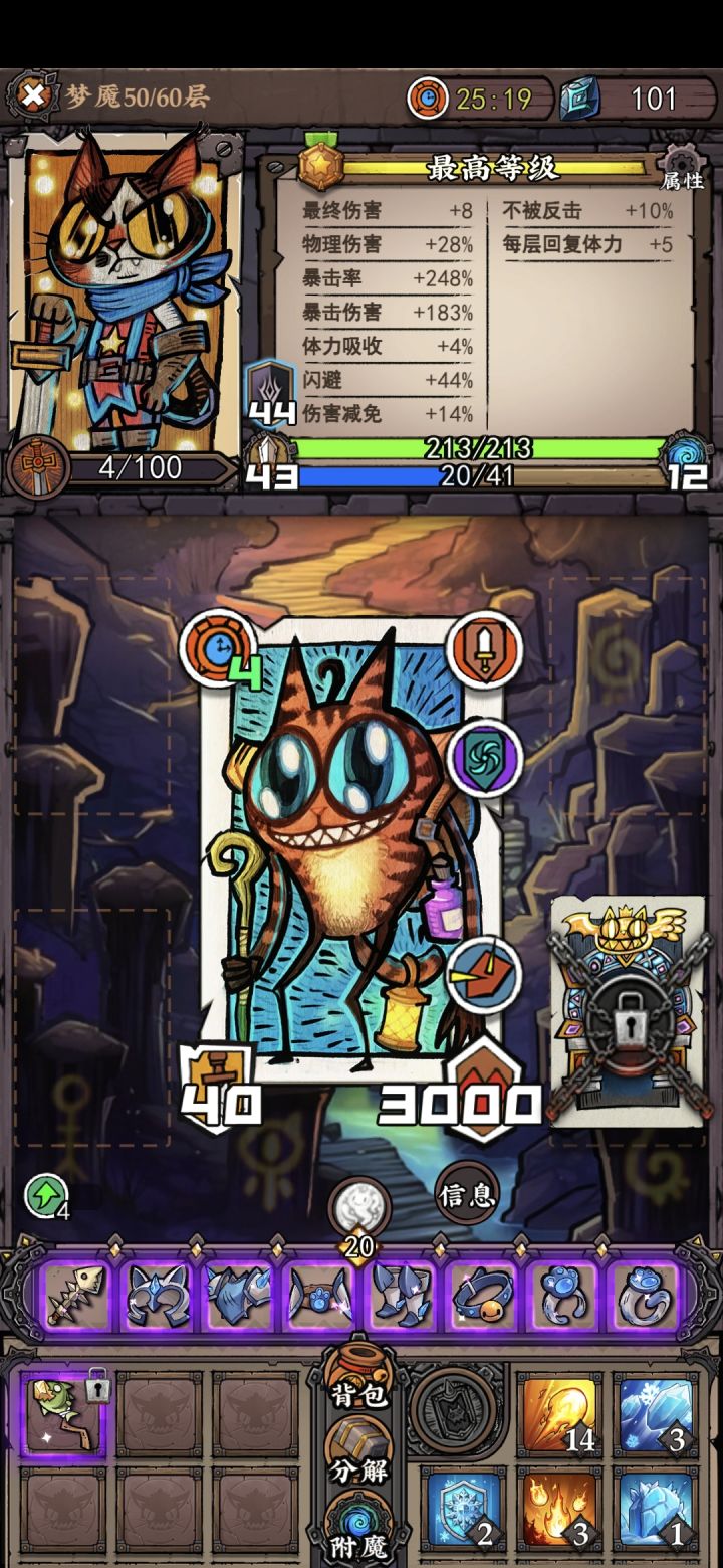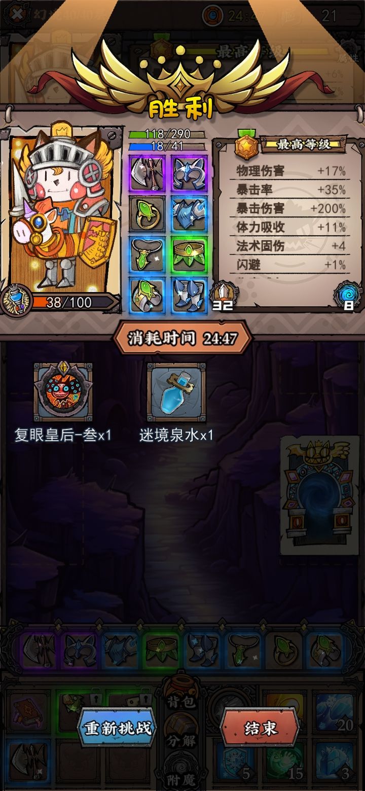 战士通关力感觉还不错崩溃的问题重装到手机上就可以解决,不过得重打一遍顶着小鱼干debuff把boss扬了,打完了血条里没有一滴血是自己的攻击性法术都用来清道中不想碰的小怪了(特指闪避和仙人掌)冻结的用来恶心boss非常不错比较期待后续关卡和其他系统