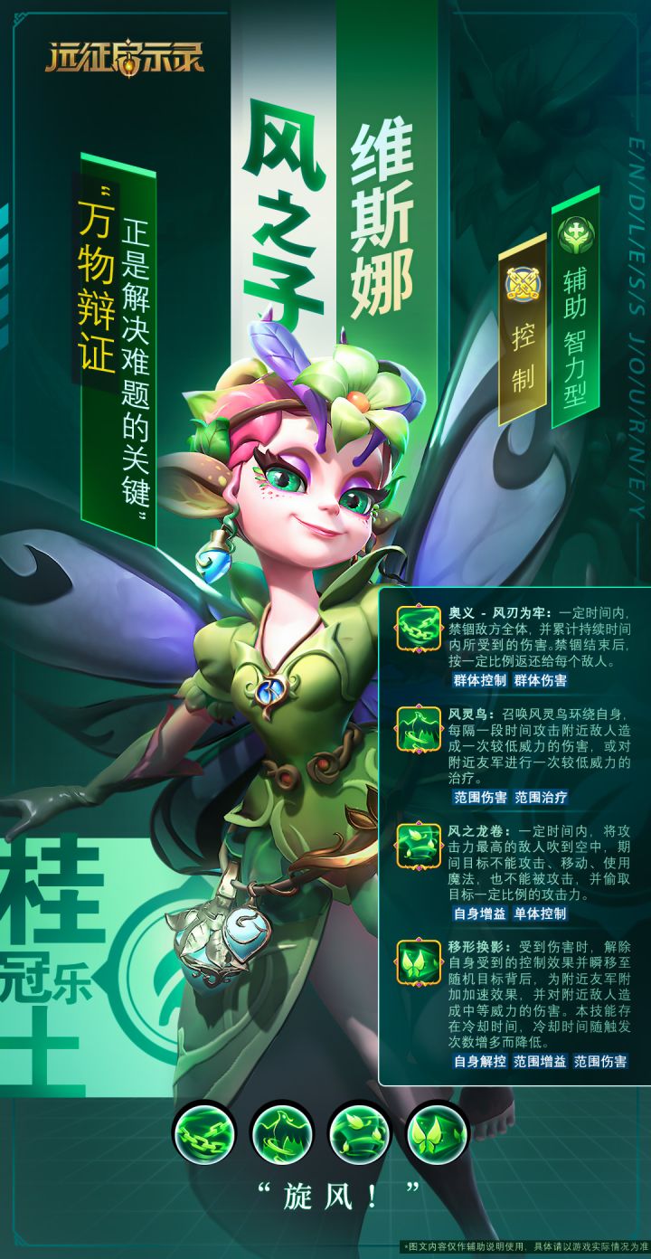 维斯娜诞生于风中。在数百年的飘荡中,维斯娜见证了桂冠乐土的一切。曾经每天喜欢恶作剧的精灵,变成了顽强奋战的风之子。极夜褪去,维斯娜已经明白,只有胜利者才能书写未来。而她从未输过。