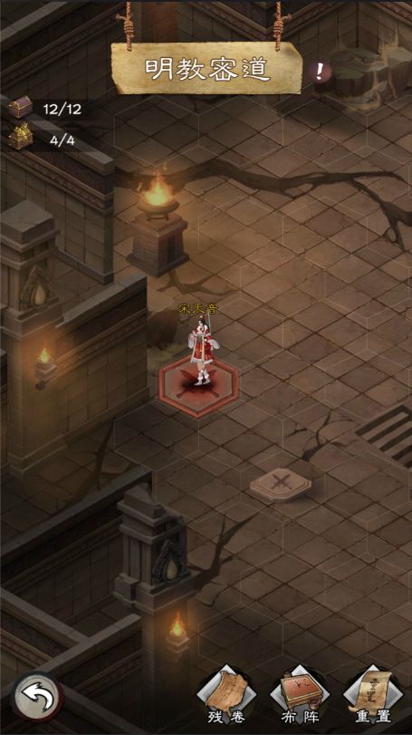 进入明教密道,清理完周围怪物,先来到左下角,激活红色,剑图标进入旁边楼梯,走到右上角进入旁边楼梯拿到箱子后,从楼梯原路返回,再次激活红色,剑图标进入旁边楼梯,激活蓝色,拳图标向左走,去激活黄色,刀图标再次返回,激活蓝色,拳图标进入楼梯,激活红书,剑图标然后向中间走,去激活绿色,掌图标来到右上角,这边的怪先打了返回去,再一次激活红色,剑图标进入楼梯,激活蓝色,拳图标激活黄色,