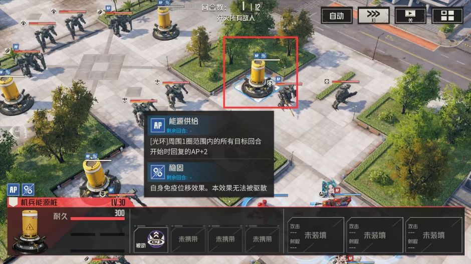 普通生意 要站在能源桩的九宫格范围内才能恢复AP,由于能源桩是可攻击的状态,所以千万不要给打破了。 机兵挑战(海量战斗) 本关虽然要面对非常多的敌人,但在打完第四章,拓殖许可等级解锁到4-1之后,我方升级到37级之后,几乎没有难度,而且关卡中还有补给点,让战斗难度更低。 速度激情(堵路) 第一回合:黛娜与格兰特移动到图中位置 第二回合:黛娜与格兰特移动到图中位置 大盾兵用盾牌猛击将图中机兵击退,堵