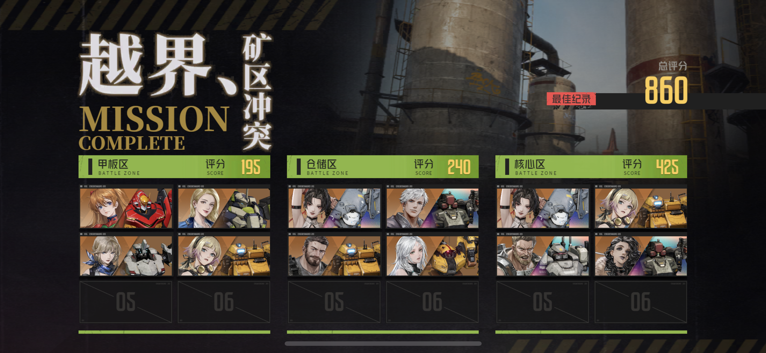 出场阵容(战力738908):淀真嗣(5命/7+16/金3一号机+彩右臂/隐形增伤背包/彩重狙)、明日香(3命/7+16/金3二号机/再攻击移动背包)、虹(4命/16+7/彩格莱杨/移动增伤背包)、艾琳(1命/1+16/彩马尔萨斯/银闪模组/技能携带石墨弹头)、梅丽莎(3命/1+16/金2金3开拓者)、奈奥米(1命/7+1/金3金2日弩/两把彩导弹)。 四回合前赶路,尽量把小兵除掉,四个小boss