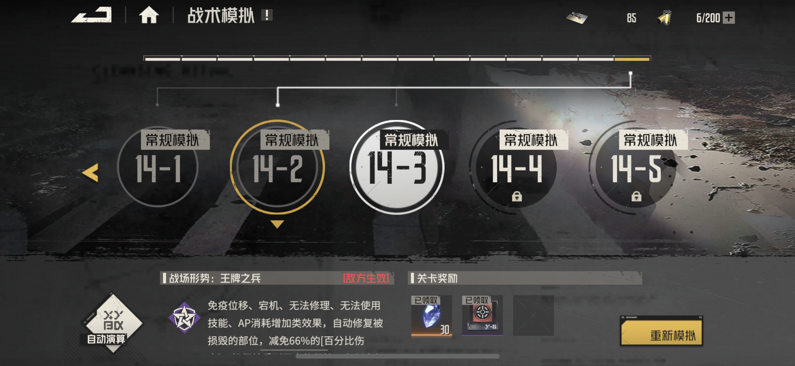 14-3打不过去,只能打过14-2,先打左边的三台机兵,以威廉攻击为主,威廉好用。出场阵容战力635057:威廉(2命/16+7/彩金刚/出力破甲包)、芙烈达(3命/16+7/彩暮色/移动破甲包)、艾琳(1命/1+16/彩马尔萨斯/银闪模组)、梅丽莎(3命/1+16/金2金3开拓者)、凌波零(2命/1+10/金3零号机)。
