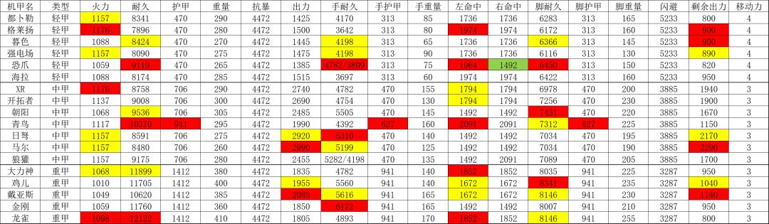 这个氪佬不用看 收集党也不用看 首先机甲要养的数目,七台 三台轻甲,三台中甲,一台重甲 轻甲:(暮色之牙,格莱昂,恐爪) 首推暮色之牙 至少养一台暮色,暮色是通用甲,而且相当稳定,轻甲角色都能用,就算是虹,新手开荒也可以一手打桩机,一手机枪开荒 然后暮色之牙,恐爪,格莱昂这三里面养两个, 恐爪:高命中,缺点是越级开荒武器本,竞技场啥的,基本没啥命中,然后彩模组的加伤不好触发 格莱昂:虹专机 中甲: