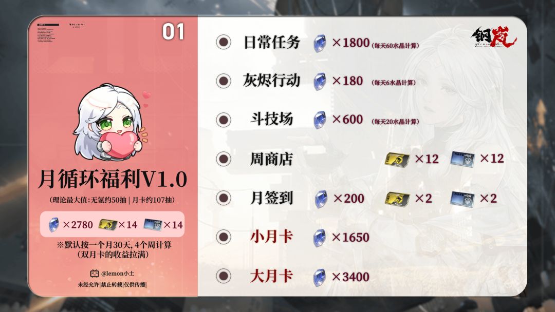 本文主要收录一些商店和循环福利的情况,分享一下游玩钢岚的一些小见解。 如果你有更好的方案可以到评论区分享你的见解。 ※叠加本文不鼓励氪金,只是分享一些收集到数据和建议给大家。 每月可循环福利: 而钢岚的每月可以重复获取到的抽卡资源有:50抽。 有双月卡的话,每个月一共有107抽。 氪金礼包的收益指南: 该数据仅供参考。该数据仅供参考。该数据仅供参考。 首充双倍的收益(1:10) 非双倍直充收益(1