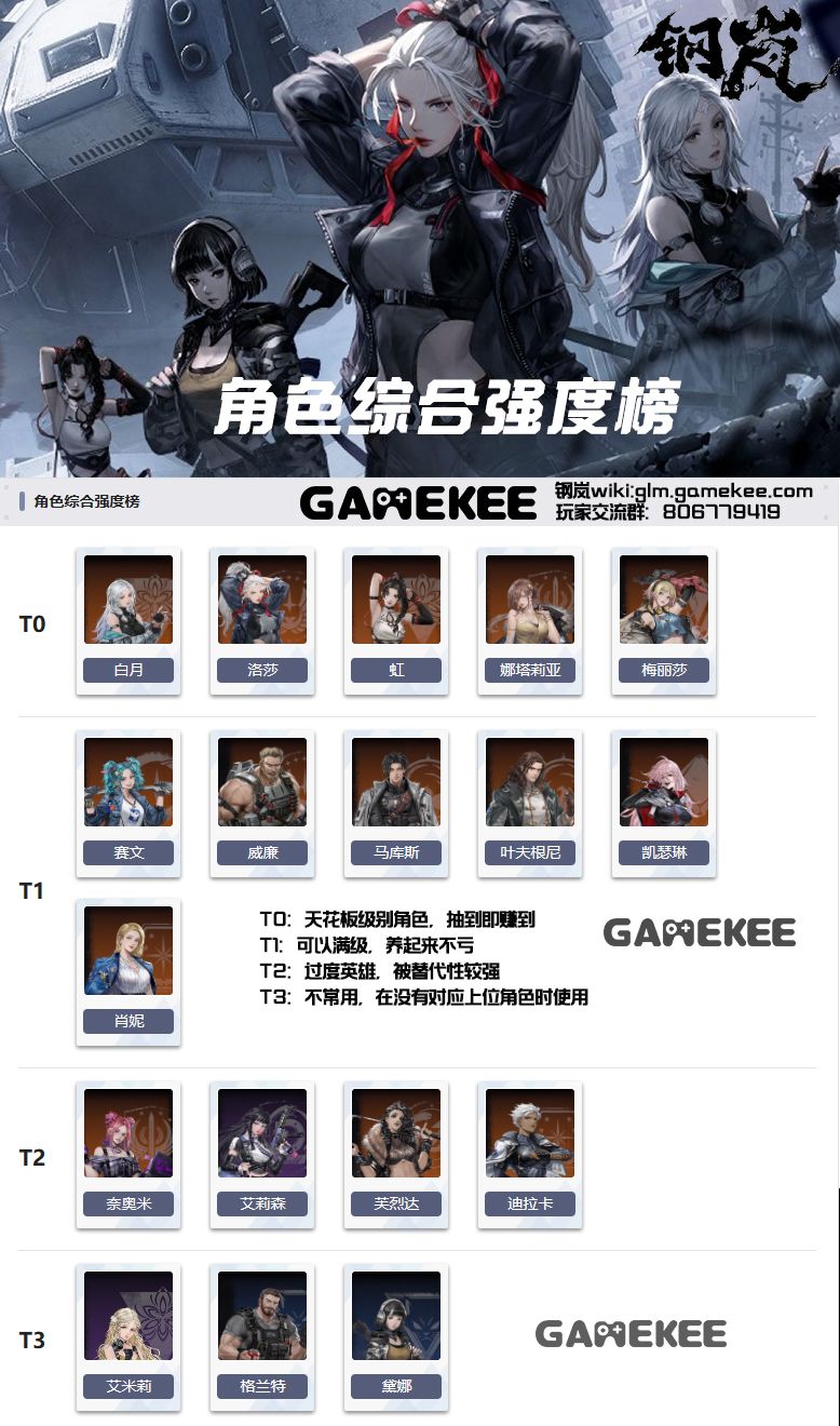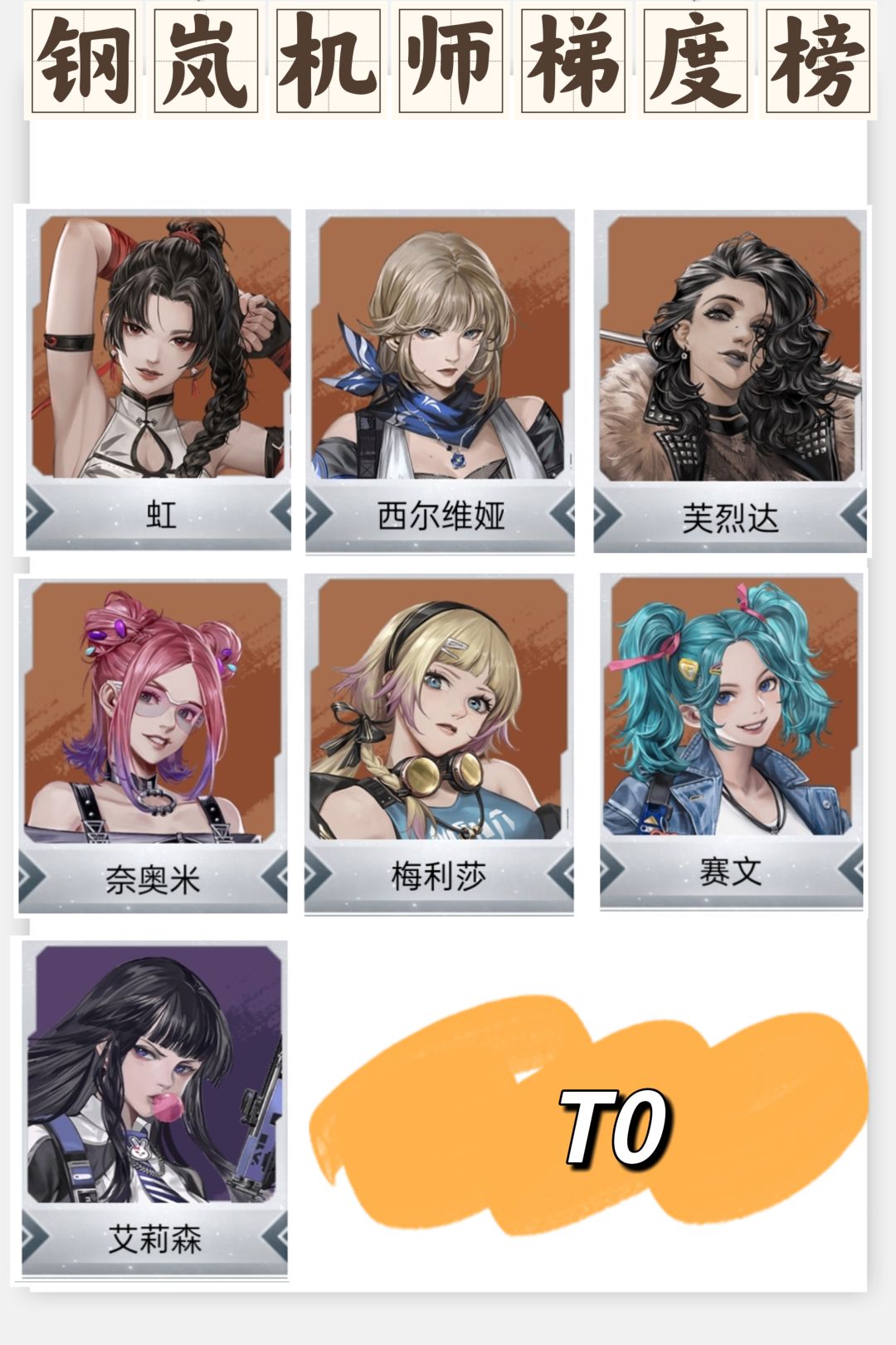 ✨其中芙烈达要有暮色之牙 马库斯要有飞行背包 凯瑟琳要有3命 娜塔莉亚/黛娜 开日弩/青鸟 (没青鸟可以开日弩带2个低出力导弹,奈奥米可以用多余的XR,带两个低出力近战) ✨解释一下为什么把艾莉森排T0 因为她的机制无可取代,打首领关/BOSS关很好用,帮助队友锁头,跨等级开荒很强,目前找不到平替。 ✨ 赛文其实想丢进T0.5的 梅丽莎更好用些 机器人可以吸引仇恨,替队友挨打 相