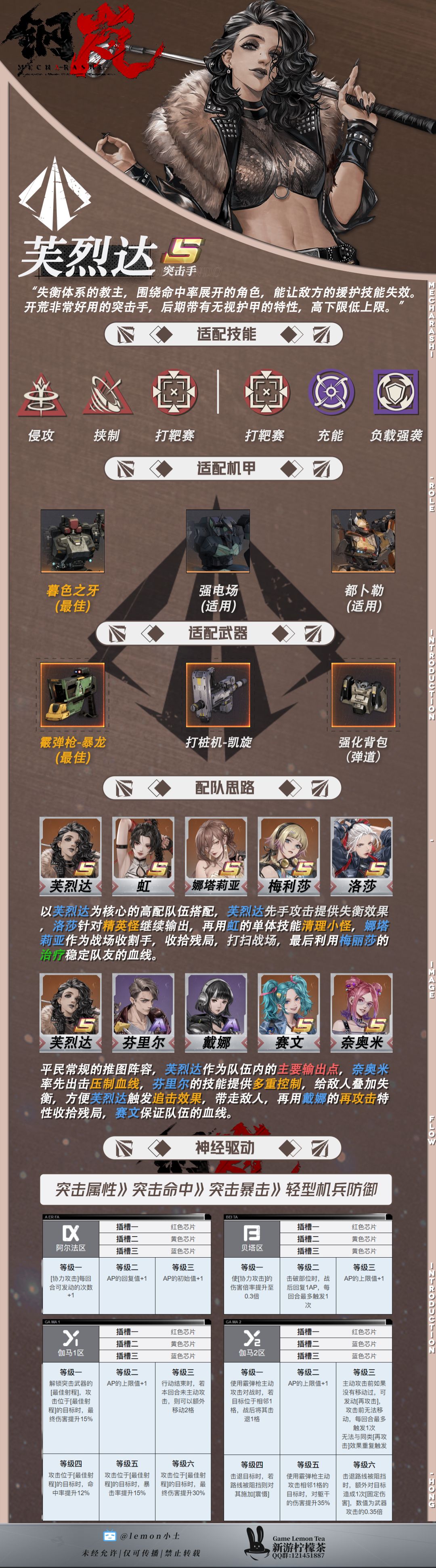 本期带来的是芙烈达的一图流攻略,如何简单搭配芙烈达的装备! 喜欢的话麻烦点个关注,B站@lemon小土。 做完图的时候发现大伙在吹芙烈达的后期,芙烈达这个角色很复杂。会长期更新这个帖子。 可能芙烈达与暮色之牙的后期风评会反转。但是还建议大家理性讨论。玩游戏开心最重要~#聊聊钢岚游玩体验#攻略#游戏安利#游戏推荐#钢岚#游戏讨论