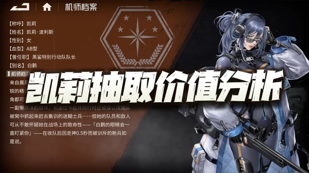 大家好,我是正在凝神的何二维一。 今天的攻略咱们来简单聊聊有关白鹳凯莉的抽取价值分析,其中部分实测结论来自于昨天开启的测试服,当然也不排除在11日正式服更新后会有些许调整的可能性,大家还请参考即可。 首先凯莉这位角色能做的事,或者说能提供的功能,这里维一先总结一下: 输出:这点需要明确的是经过测试服的实测,在一般练度下(例如人物潜能3以下、机兵在金1左右),其输出的强度并不能让人满意,对比目前基本