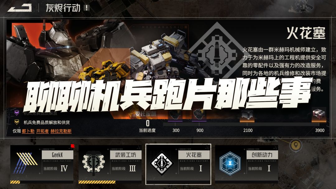 大家好, 我是正在选择机体的何二维一。 今天维一的灰烬行动第一轮算是终于跑完了,所以今天的攻略咱们就来回答一下这些个有关灰烬跑片问题,因为内测当中时间不够,所以这个大家俗称的机兵跑片系统也不太做完整的体验,所以只好等着这次跑完一轮后再说,接着咱们就正式开干! 首先目前这个跑片系统有4个地区可选,其性质有点类似于天地劫当中的“山河志”系统,当然此类跑片系统在梦战中也是有的,只是钢岚因为有机兵和机师之