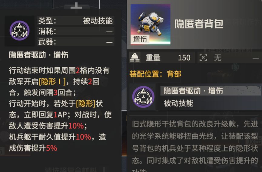 破刃之劍原创,转载或引用本文请注明来源及原作者 食之无味、弃之可惜的隐匿者背包 “无止的逆流”版本,钢岚新增了第三款彩色背包——隐匿者背包。作为隐形背包的升级强化版,它的到来没能为隐形背包带来荣光,整体效果是比较一般的,价值不高,为何如此,且听笔者带来分析。 隐匿者背包其实就是隐形背包和干扰增伤的复合体,同时额外增加了有条件的1ap回复 在谈论隐匿者背包的价值之前,笔者先简单说明一下隐形效