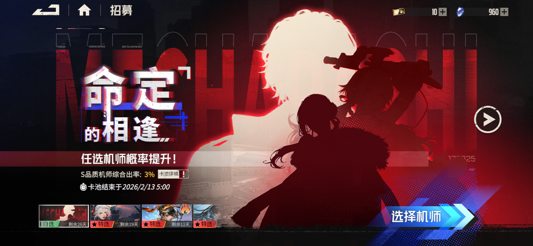 大佬们,萌新刚入坑,看了很多攻略,很多 很杂 ,各种时间的都有,越看越迷糊了。请各位大佬给我指条明路 当前版本怎么开局。自选机师 机甲怎么选 , 哪些机师 机甲必抽。 谢谢了各位大佬🙏