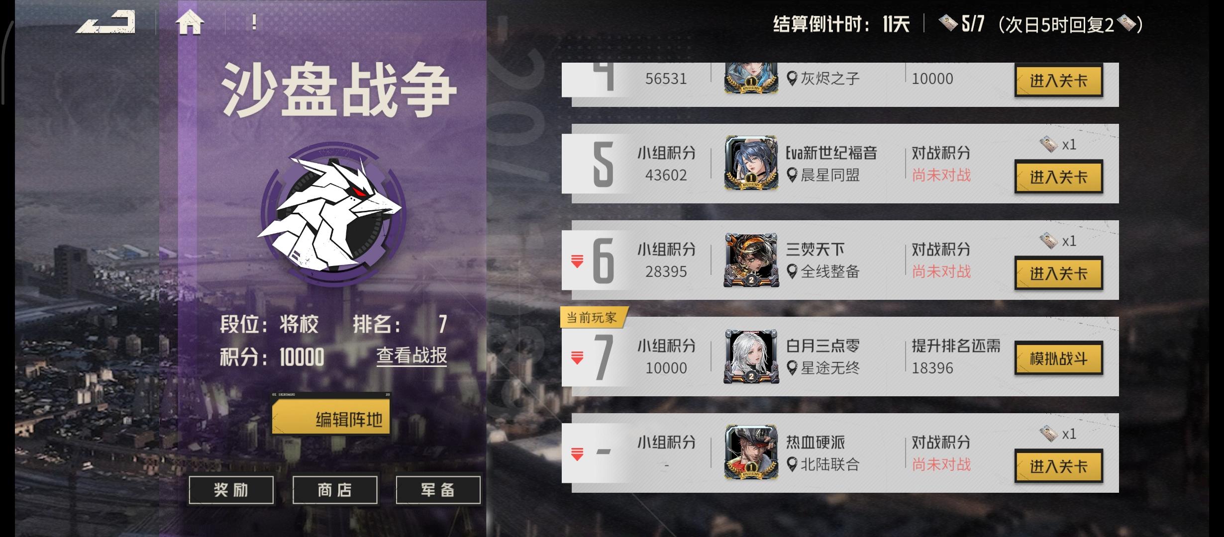 拓植8-1(63级)芯片12-2,沙盘将校存钻27570,黄票125,蓝票183战力暂列28。