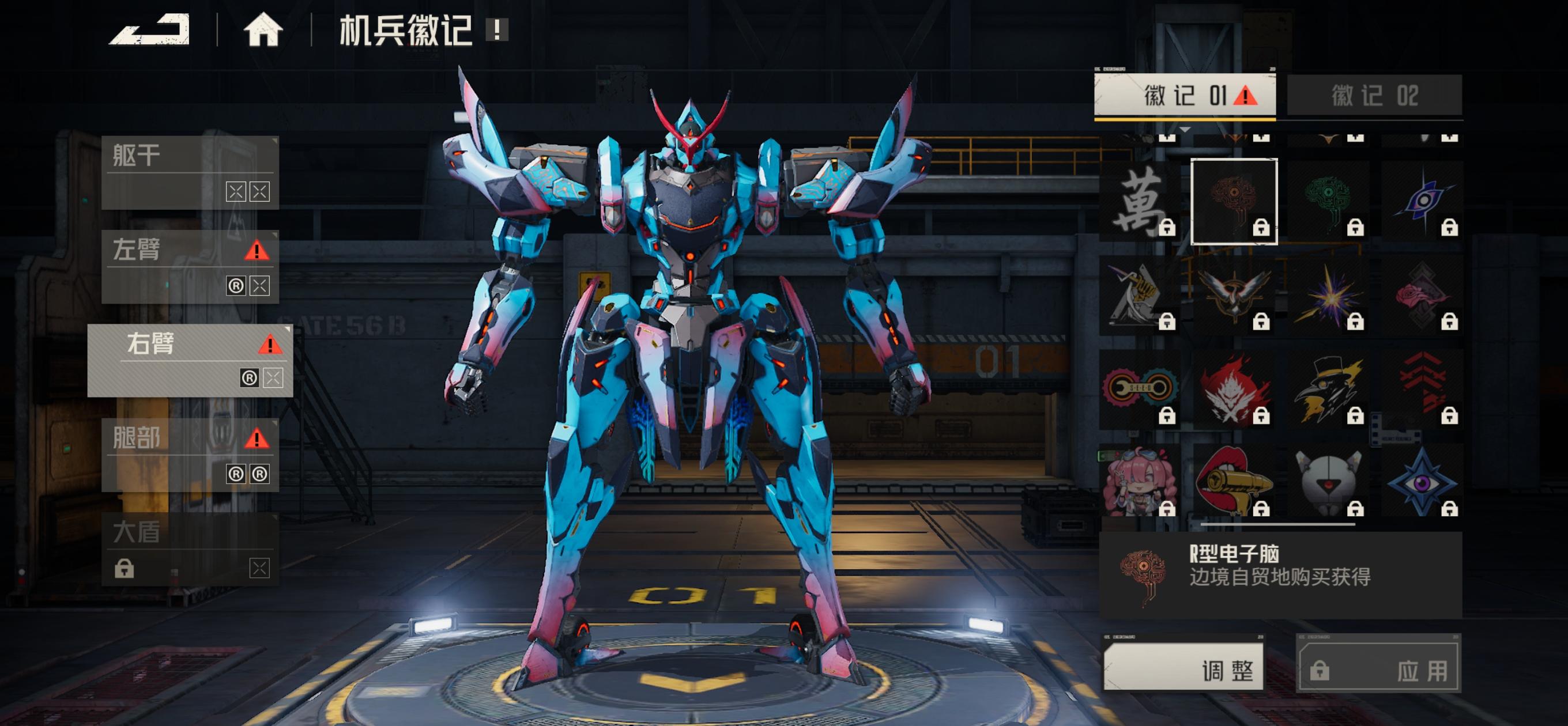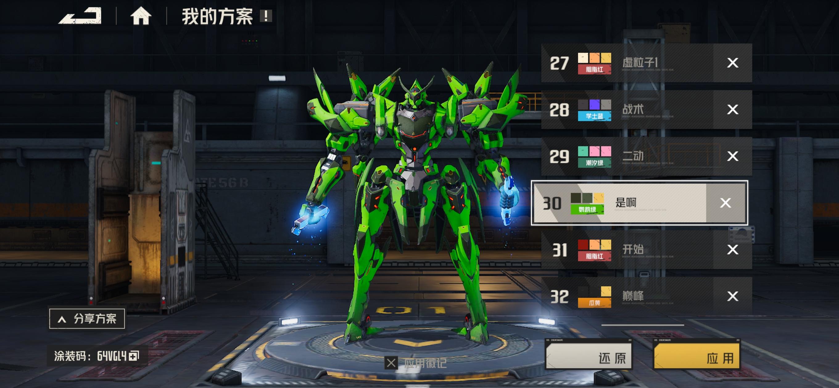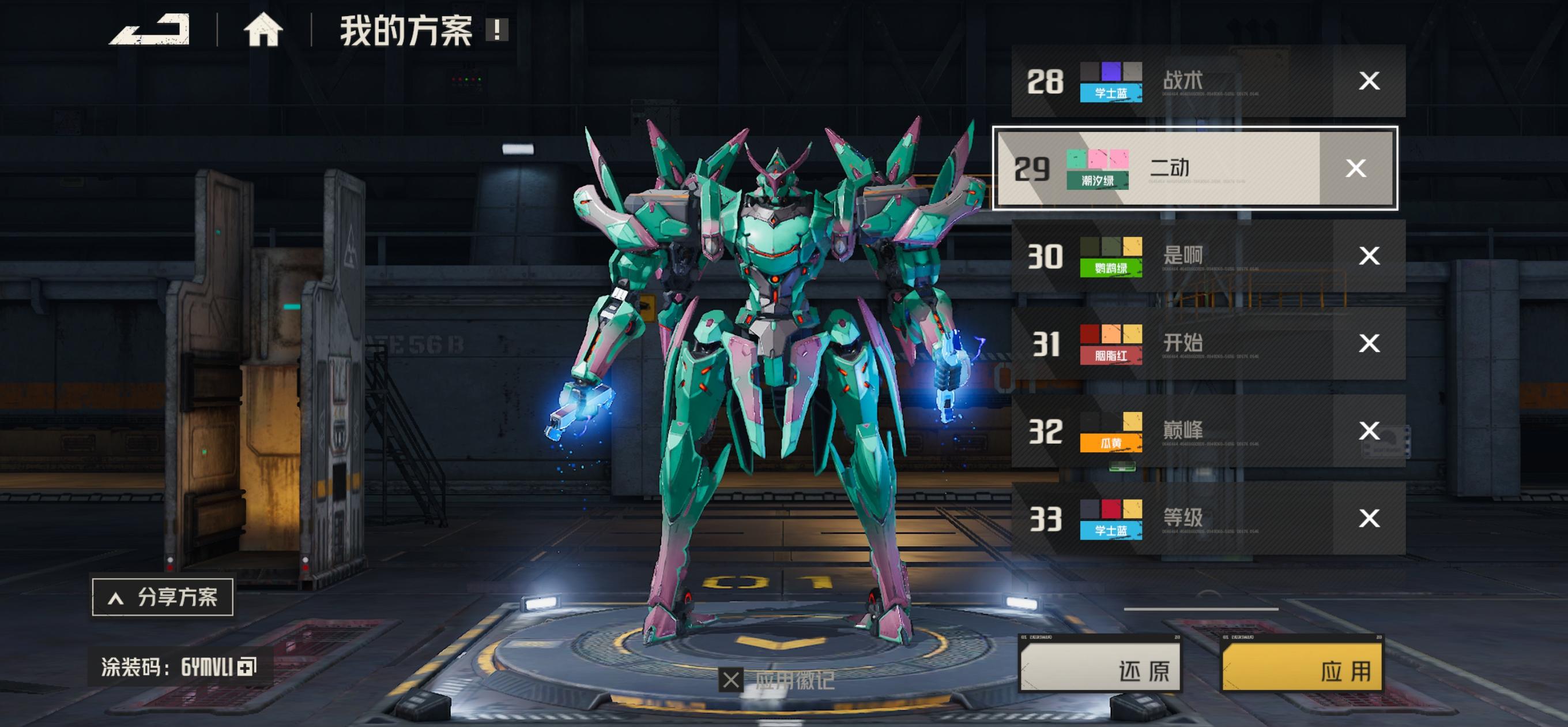 涂装码ZX5AMN64VGL46YMVLISZRORI这次用的涂装比较平民,鲜明的颜色加深色打底会使机甲显得更立体,进图效果更好。124号涂装主要遵循的原则就是色彩区域2的涂装要深色,其他几个色彩部位凭自己喜好选就行。有条件的可以像图五增加一点细节,不过无伤大雅。#钢岚涂装