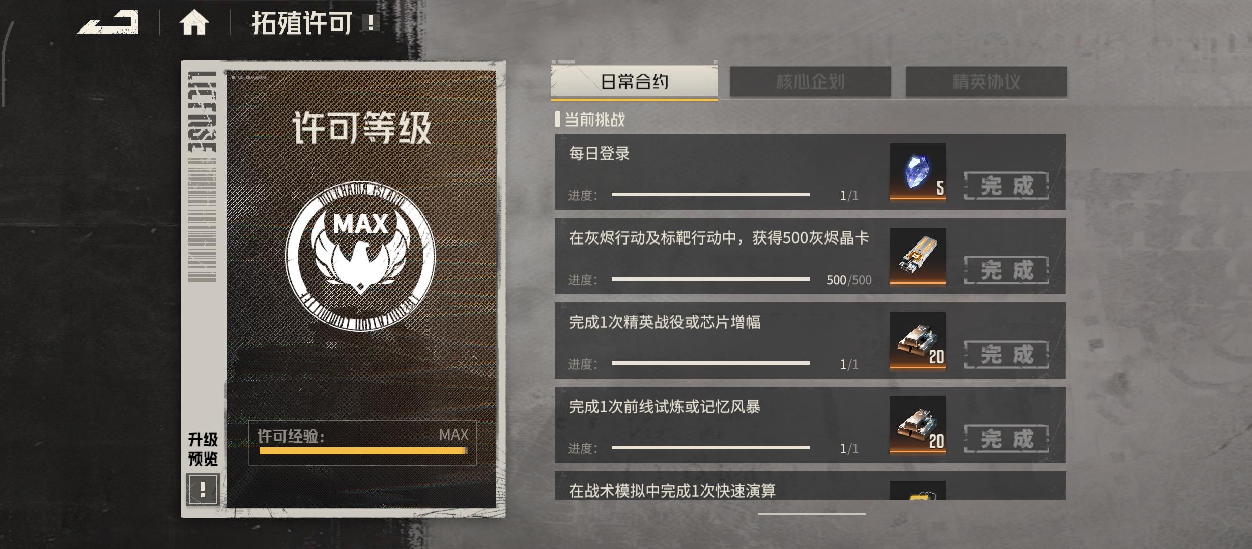 早晨,上线点科研,约15分钟:1.灰烬行动收菜昨天留下的4个派遣,再放派遣。2.战术模拟扫荡3/5次。3.记忆风暴扫荡3次高额。4.首领剿灭(先压至1回合)14或15扫荡1次,晚上将扫荡次数全用掉。5.精英战役12或13扫荡1次,晚上将缺科研材料的关全扫荡。6.单人过标靶行动(关掉支援)。7.10分钟后点开灰烬行动,再放派遣。晚上,内容少玩不了多久:1.一天借一次助战推讨伐本,一