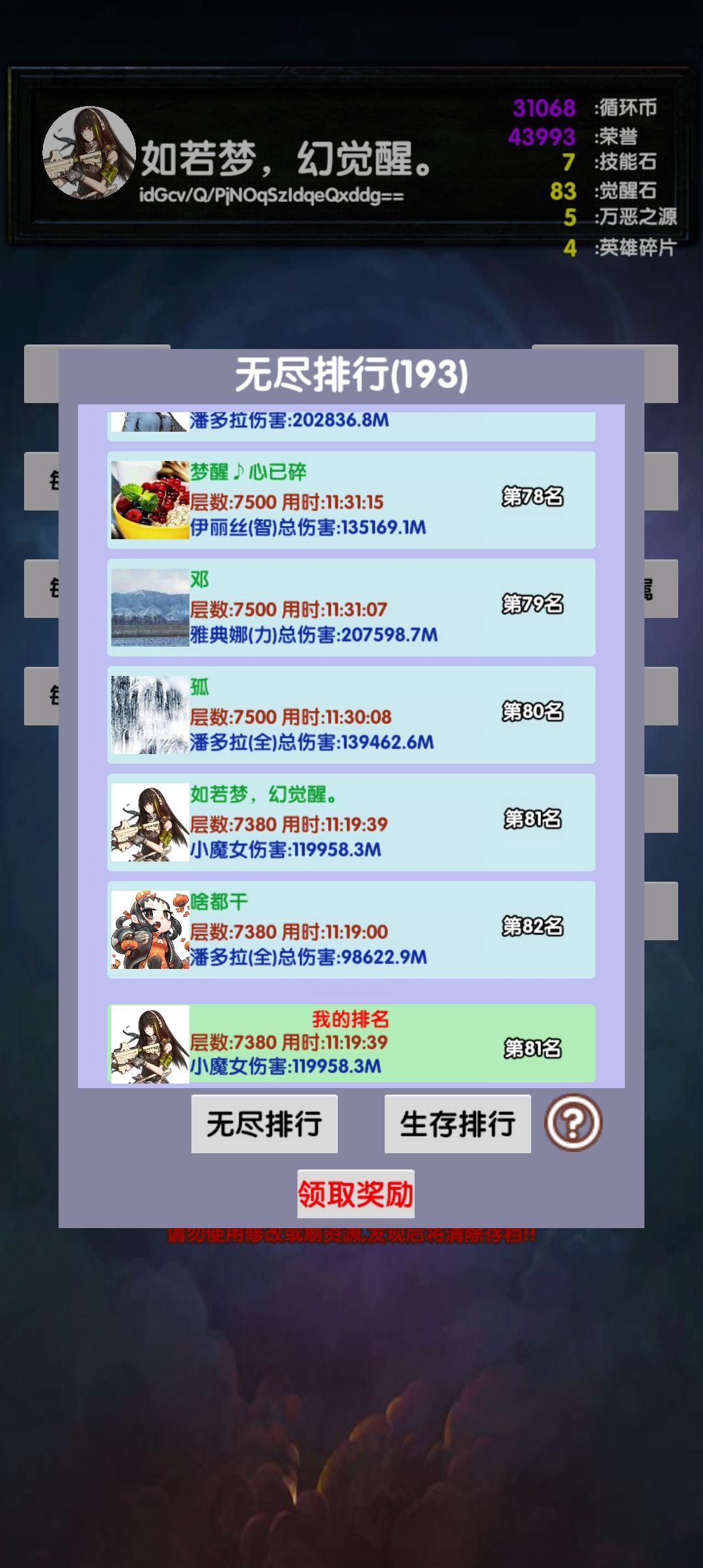今天的卸载弄的新号 其实就打正经刷了四次 一次难度一 两次难度三 一次难度五 剩下的几次都在试验 没有难度 主要是方法 2.10只要过了3000关都能无限挂着 主要是怎么过难度七的3000 审核过了再说 我这个是两天才领的觉醒石 下午玩的加第二天凌晨 不用觉醒咕叽你也刷不了难度七 首先讲讲咕叽bug的原理 咕叽伤害是最大生命值的百分之一 的真实伤害 听起来很弱才百分之一 但是强在他可以杀人 因为是