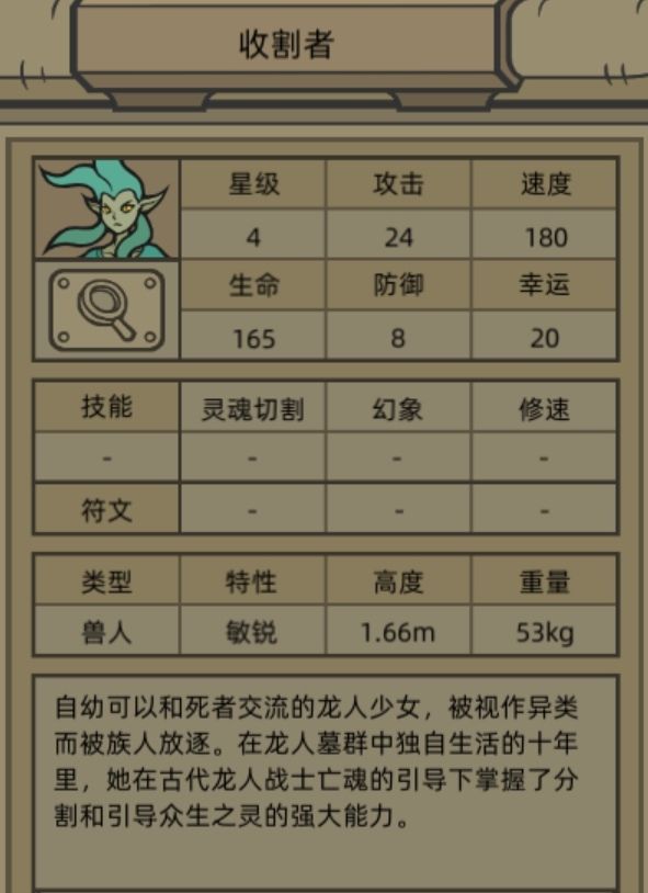 前情提要: 在暗语森林隐居的龙人部落和平安宁的生活被突如其来的袭击打破了,亡灵入侵了村庄并杀害了很多人。在艰难击退第一波入侵的亡灵后,村子里的人找到可以和死者交流的龙人战士"收割者”,希望她能拯救这个曾经放逐了自己的村庄。 英雄面板和技能介绍: 核心技能 每次攻击命中敌人后,临时偷取敌人最大生命值并转移给我方随机单位,享受到该效果的我方单位临时提高与技能等级有关的攻击力(上述效果仅在本场战斗有效)