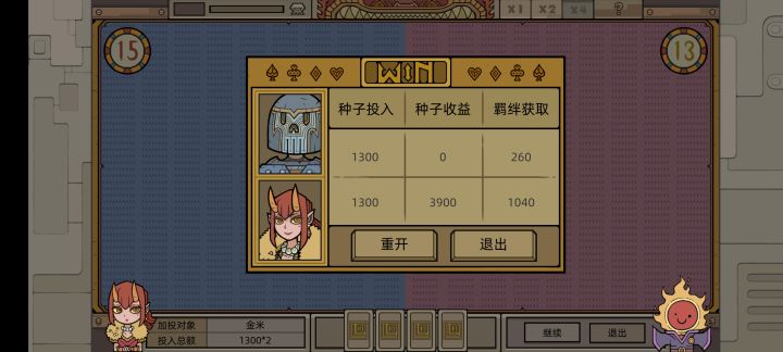 除去sl大法,设置里退出登录也可以刷出来云存档,评论已经有人发现了。思路经过改进,是这样:开局两种思路,一种全压自己,通赢存档,输了回档。第二种是分开压,压自己需要的羁绊。当灵魂种子开始多了以后,以刷羁绊为目的,就不需要为了种子反复sl了,但是灵魂一定要,不然没法开牌。①以第一种全压自己为例,开局先看自己位置,四号位直接重开,没必要看了,浪费时间(如果第一张牌是魔王牌或者10可以试试)。