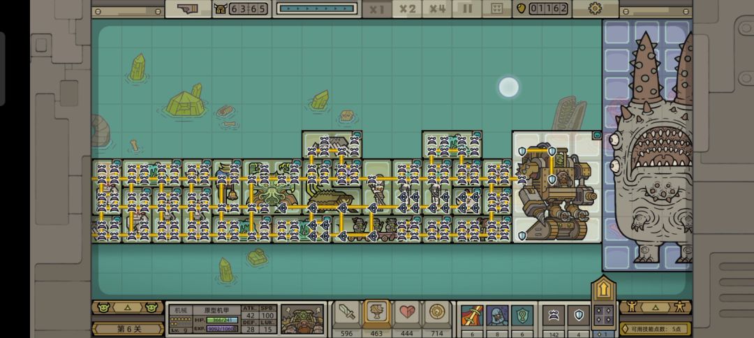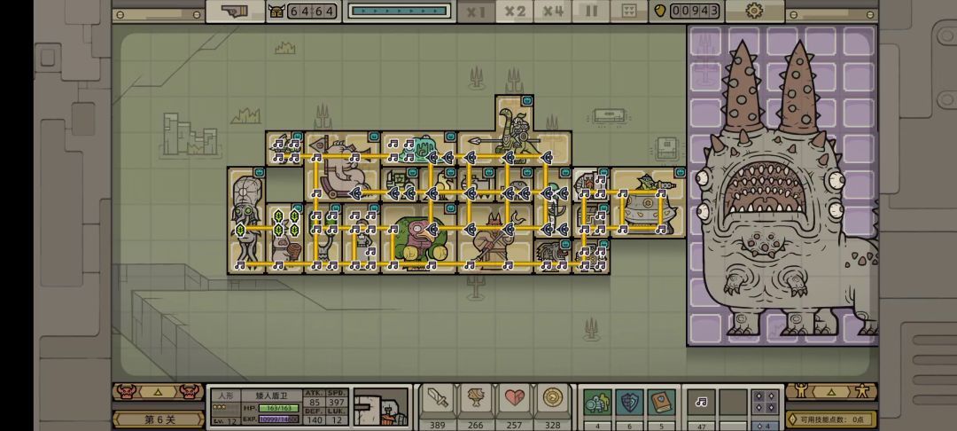 这次选用的是火腿大师这个英雄,主点1技能【熏烤专家】(从技能面板来看的话【熏烤专家】的强度还是比较可以的,可以“人造”一个盾墙,但是可能是因为我更习惯了盾墙和铁壁的稳定存在吧,感觉【熏烤专家】的强度比较一般); 出门推荐,带烈焰猪,蛇蔓兽叠面板(没有解锁蛇蔓兽的话也可以出精英猎手给破甲),领主的话,还是带的妮可可以给野兽和植物(植生兽)额外的经验值加成,对于蛇蔓兽和烈焰猪都是不错的,而且第六章的两