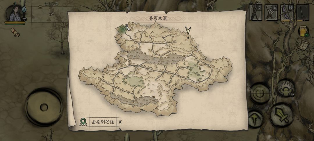 第一章有很多小任务,但有剧情的长度支线整体来看只有两个: “吊睛大虫”(老虎) “蝙蝠首领” 隐藏任务会延续到后面的章节,我们放在最后。 任务一:老虎 看过我主线攻略的朋友应该知道,在推主线的过程中会接到NPC芷雪的一个任务-“野外的探险者”。接取后我们需要前往荒山位置(如图),找到NPC-范庭,他希望我们消灭一只老虎🐅。(*此处可接取小任务-虎纹虫毒液)。老虎位置如图,从荒山传送点出来向东南走一