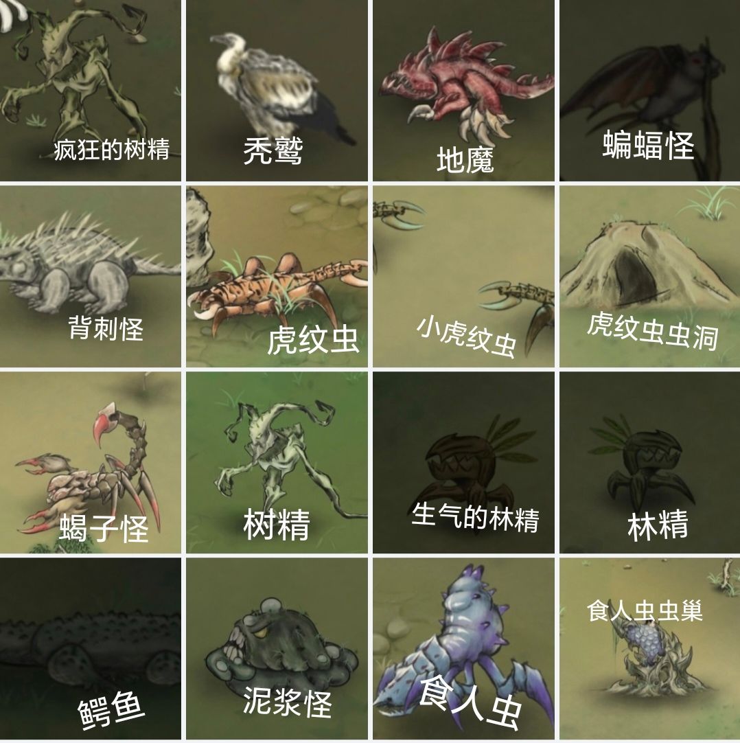 *所有怪物均有概率掉落铜钱,在受击时概率掉落生命石和灵力石。 光环怪物具有更高的属性,同时具有更高的掉落率,普通怪物中,非光环最高掉落蓝箱子,光环怪物则最高掉落暗金! 怪物的等级和玩家等级均影响掉落宝箱中装备的等级。 (生气的)林精:小为绿,大为褐,会冲向撕咬玩家,仇恨距离很短。掉落发光的树叶。 蝙蝠怪:分布于荒芜之地的树上,会飞向并咬伤玩家,空中目标,飞向玩家的时候可以被近战武器击中。可出售:3