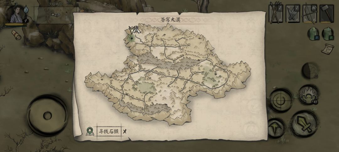 到达图二后我们会看见第二个大姐大NPC-秋月,与之对话,得知暮白就在上面一点的位置,向上走和暮白对话。 暮白向我们推荐了“如来佛祖玉皇大帝观音菩萨指定取西经特派使者花果山水帘洞齐天大圣”-孙悟空,没错,我们的猴哥现在又来帮我们了,位置如图。 到达后发现大圣正在睡觉,需要我们用5个桃子诱惑大圣醒来,桃子可以在图一的桃源获得,也可以在图二的东部绿洲获得,位置如图。(*此时可以去沙塔镇找守门人NPC