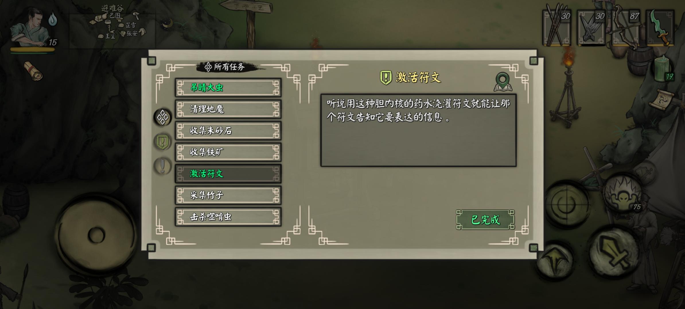 第一章有很多小任务,但有剧情的长度支线整体来看只有两个:“吊睛大虫”(老虎)“蝙蝠首领”隐藏任务会延续到后面的章节,我们放在最后。任务一:老虎看过我主线攻略的朋友应该知道,在推主线的过程中会接到NPC芷雪的一个任务-“野外的探险者”。接取后我们需要前往荒山位置(如图),找到NPC-范庭,他希望我们消灭一只老虎🐅。(*此处可接取小任务-虎纹虫毒液)。老虎位置如图,从荒山传送点出来向东南走一