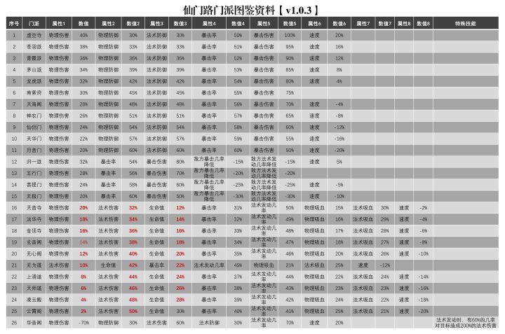 【v1.0.3门派调整】根据部分玩家反馈,为加强游戏平衡性,我们对游戏部分门派技能进行调整增强,改动处已经标红。Excel版本在群文件里,感谢各位仙友对仙门路的大力支持~