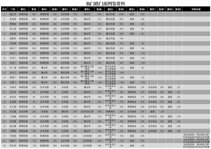 版本更新有所调整优化,请移步至更新帖虚空寺物理伤害 +40%物理防御 +30%法术防御 +30%暴击率 +50%暴击伤害 +100%速度 +20%苍羽派物理伤害 +38%物理防御 +33%法术防御 +33%暴击率 +51%暴击伤害 +95%速度 +16%青霞派物理伤害 +36%物理防御 +36%法术防御 +36%暴击率 +52%暴击伤害 +90%速度 +1