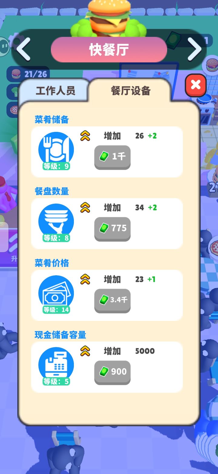 说一下里面的升级系统,给厨师升级的效果我几乎是看不出来,这就导致我厨师9级了,服务员还是1级,但仍然厨师的速度赶不上服务员的速度。
