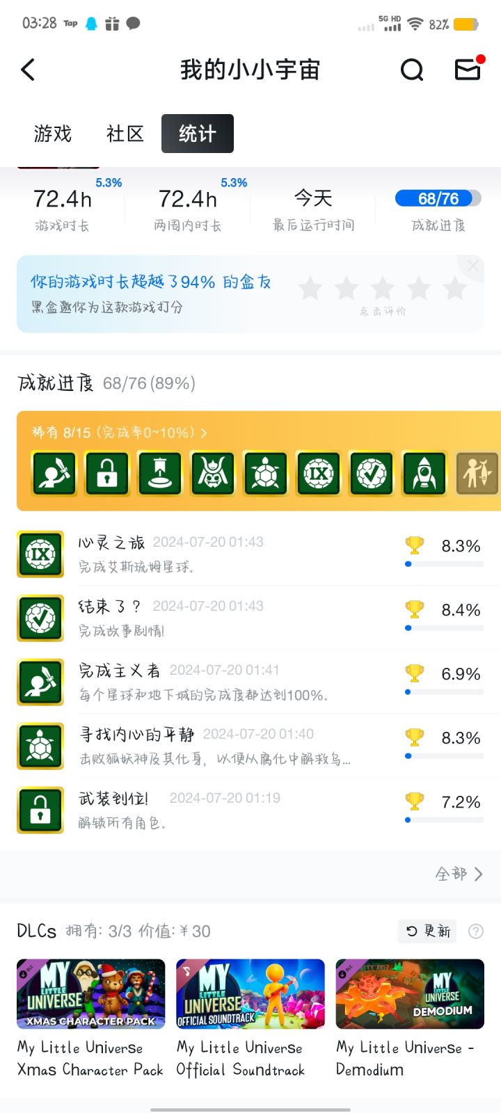 目前电脑版我本人已经通关了,加上DLC总共十颗星球,流程30-40小时(图中时长是因为我这个游戏开了两个存档,两个人玩,我自己通关就差不多这个时间)左右,后续星球的解密很有意思,我自己的话也是偶尔会挂着机刷材料,一下子扩完所有的图,这样比较舒服一些
