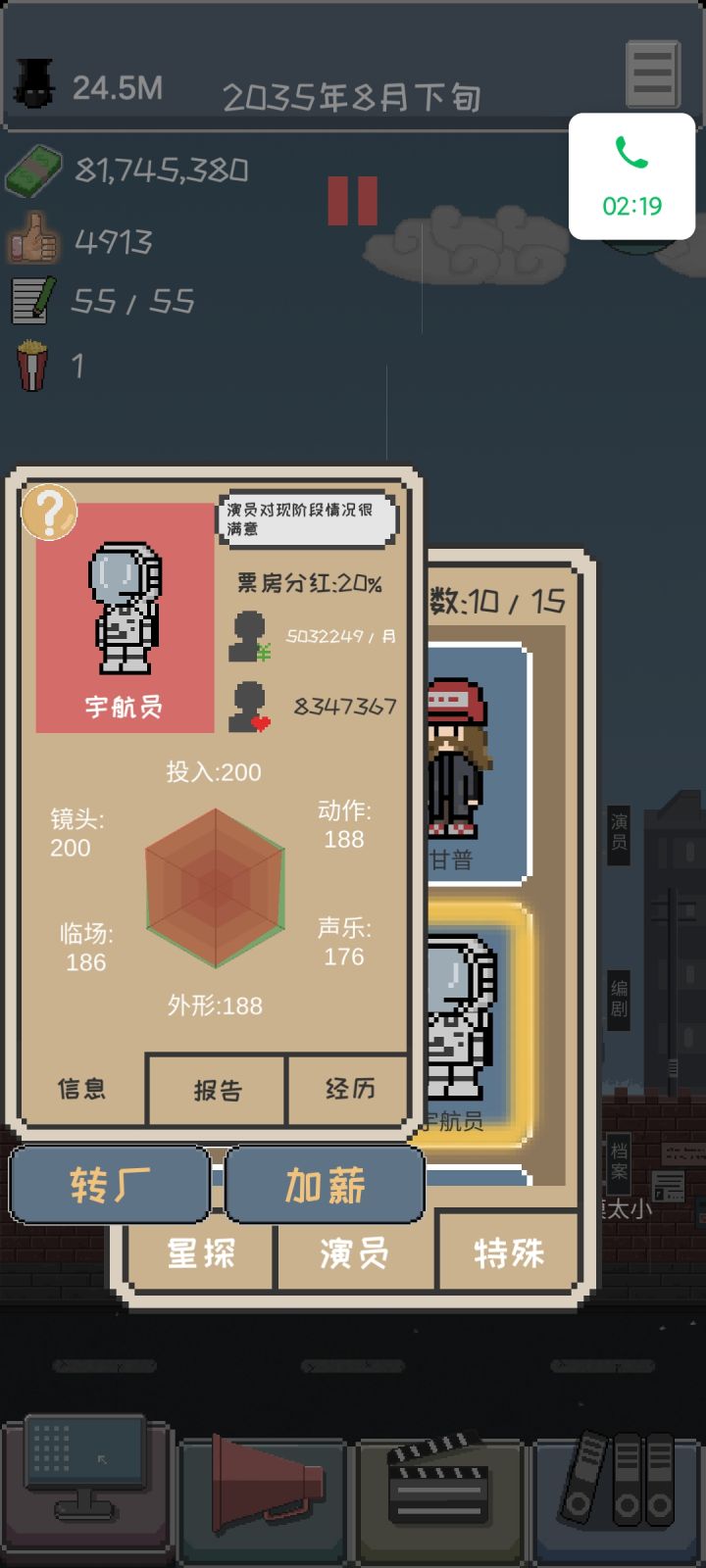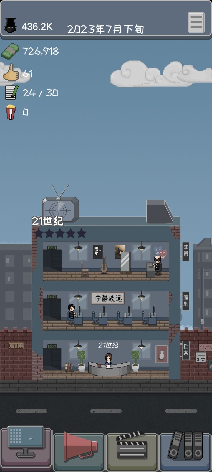 具体流程如下:买个剧本,或者自己写,接着创建剧组选择合适的人放在合适的岗位上,接着选择片场开始拍摄,以上部分都不能加速,到了这个部分依旧不能加速,接着和发行商进行合作发行,电影上映后会产出结果,玩家需要提升制片厂星级,买回制片厂股份,随着游戏难度的增加,玩家所能买到股份的渠道会受到限制,难度也会越来越高,这大大的提高了游戏的深度,但由于大部分内容都是重复的,玩起来会有些疲惫感。