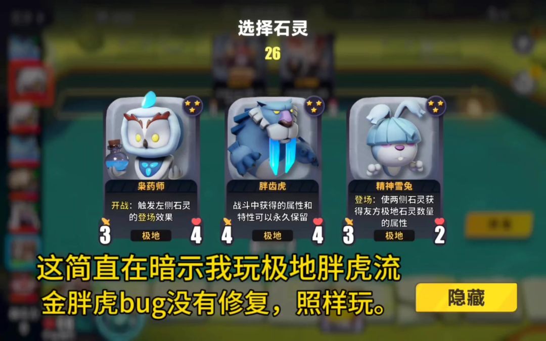 哈喽 ,大家好。我是立志于做新手教学的千山独行。(播放视频,打开文字介绍会更香) 相对于混合流,纯种族上手简单。 可以记不住那么多石灵特性,也不用管种族机制。凑核心石灵就完了。 核心石灵三个 胖齿虎 将临时属性和临时特性变永久的大哥。是这套极地的核心输出 巨牙海象 破盾临时增加属性。辅助胖齿虎成长为大哥。这套极地第一辅助。 冰熊守护 破盾永久增加属性。大哥虽然看不上。但是其他极地石灵看得上。万事