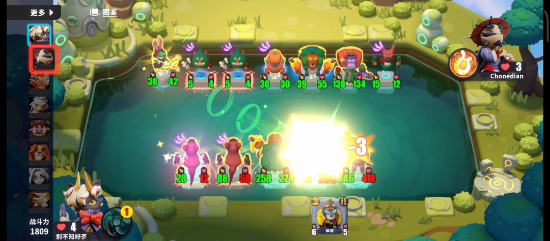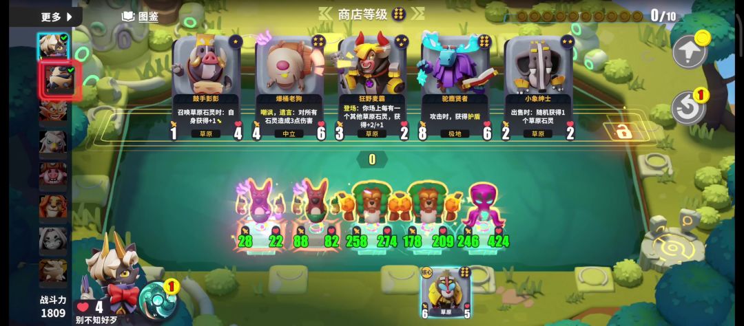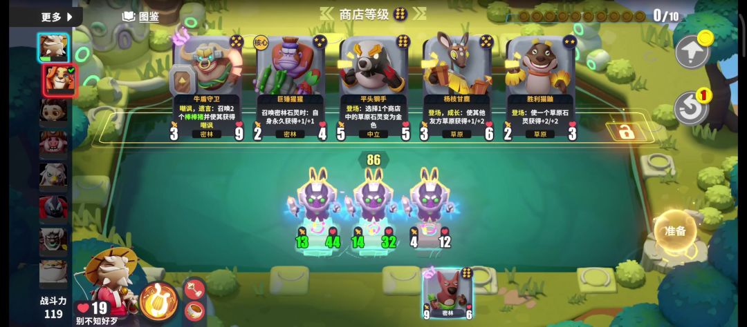 青蛙和羊铃把商店怪物养大,然后甲虫吃吃吃。 中期商店刷出金龟的时候可以把大身材的怪卖了,换有盾或者狂战的怪,然后甲虫吃掉商店大怪,无损换怪。 后期最好的是密林六星狂战圣盾大老虎,如图最后一轮抓的老虎一回合涨了八十身材。