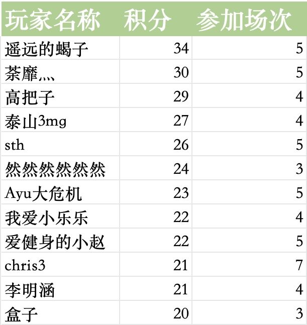 现在加入QQ群,与群友一起开黑,还能同时获得奖励!玩家群②:723614197 玩家群①:780887960(已满)各位玩家好,非常感谢大家的参与和支持。恭喜以下玩家获得本次比赛的奖品,他们的积分分别为:【强大的海象】 40分、【望海】 28分、【灰太狼】 28分、【chris3】 24分、【自由的兔子】 22分、【喜羊羊】 22分、【镜花乄水月】 21分比赛规则:1. 每日傍晚的19点