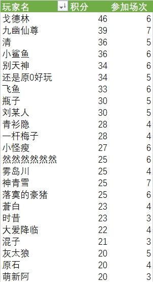 现在加入QQ群,打比赛拿奖励!🥳🥳群号:780887960 各位玩家好,非常感谢大家的参与和支持。恭喜以下玩家获得本次比赛的奖品,他们的积分分别为:【阿通】 42分、【畧】 40分、【大爱棋尊】 39分、【纯纯一萌新】 35分、【链子】 35分、【萌新阿】 32分、【倔强的蜂鸟】 31分、【扎西多吉】 31分、【齐天大怪】 29分、【墨无情】 28分、【chris3】 27分、【运气选手】 2