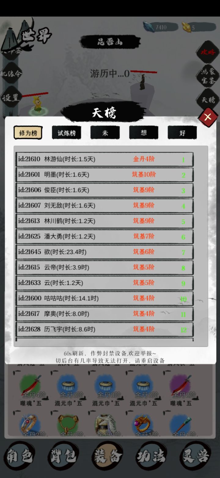 因为重开耽误10小时,晚上下班到家开的,所以我现在还差点金丹,(注意保留设备码,在设置里面,如果有丢失就看官方偷闲时候帮不帮忙找回了,不过好像没找回吧,没试过,只知道误封可以解,最主要的建议手机玩,云手机如果更换设备你就白玩了,他是绑定设备号的,而且你还要浪费钱续费)嗯,就聊这么多吧,我要看看今晚能不能冲击金丹了,拜拜