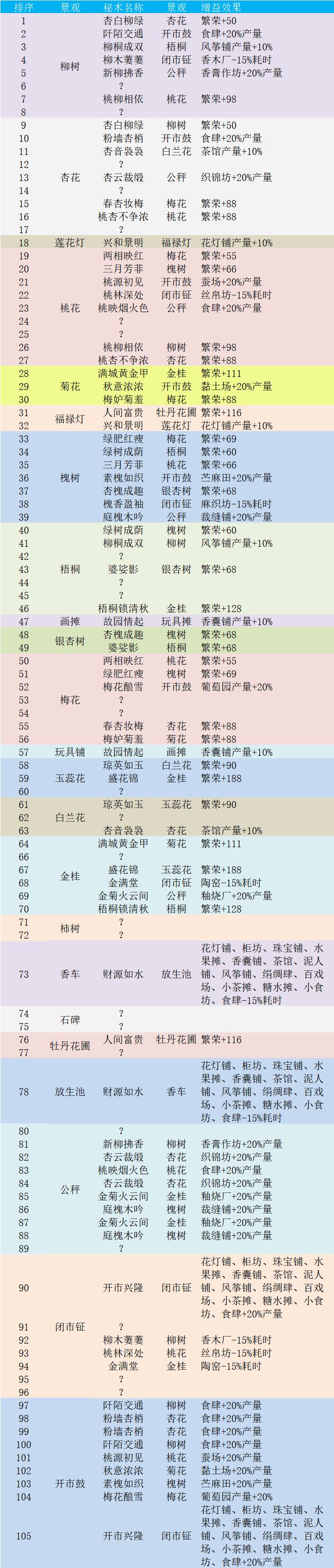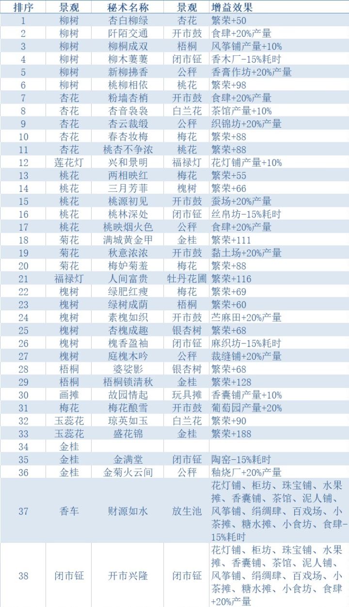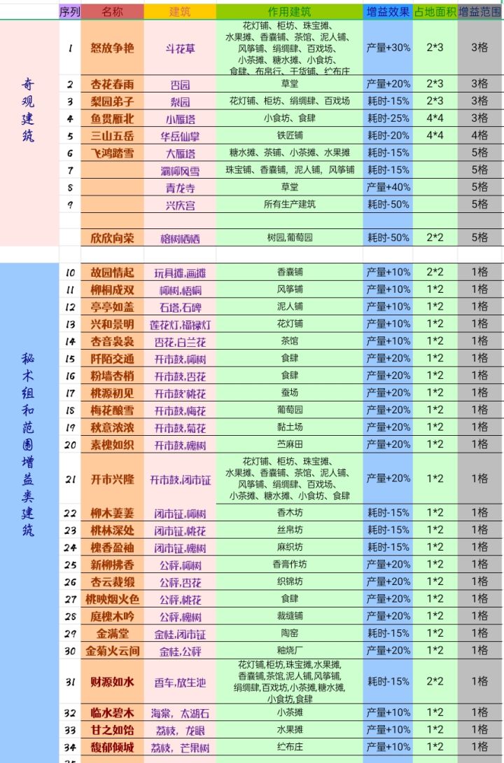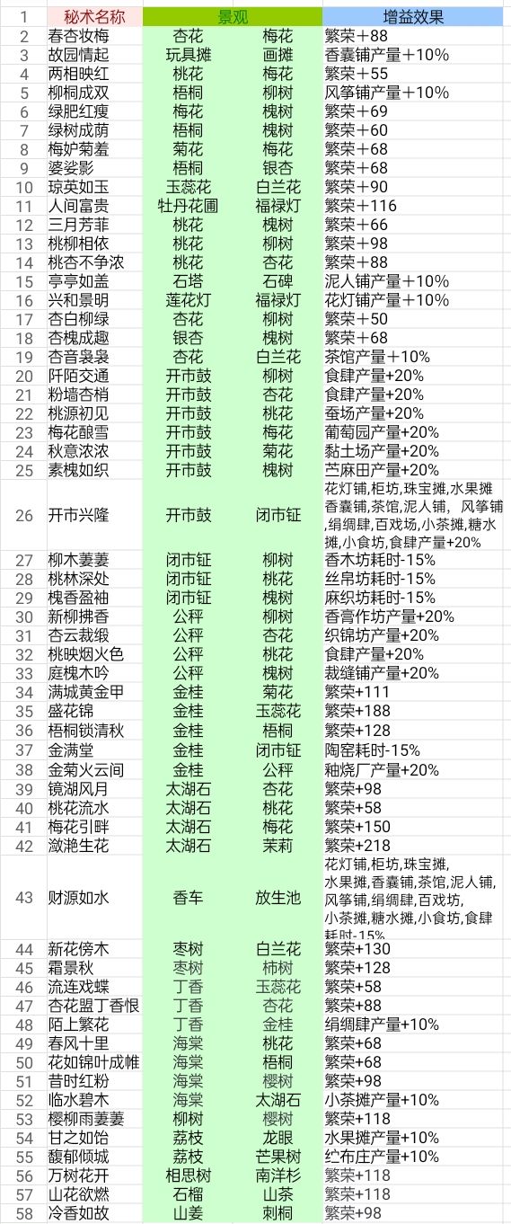 持续更新,欢迎补充!内大部分是长安秘术通知: 抱歉各位,因为月底某个画了很多大饼的游戏公测,内存不够,所以只能退坑了 我把我做的这个游戏的攻略文档链接放在下面,里面除了这个贴子的内容外,还有帮助查找和排除秘术的表格以及另一个布局帖子没添加的组合。 还有就是如果有找到不同秘术愿意和大家分享的朋友可以评论告诉我,我会更新帖子。 那么,我们江湖再见。增益类景观摆放 :[文件]画唐秘术集.x