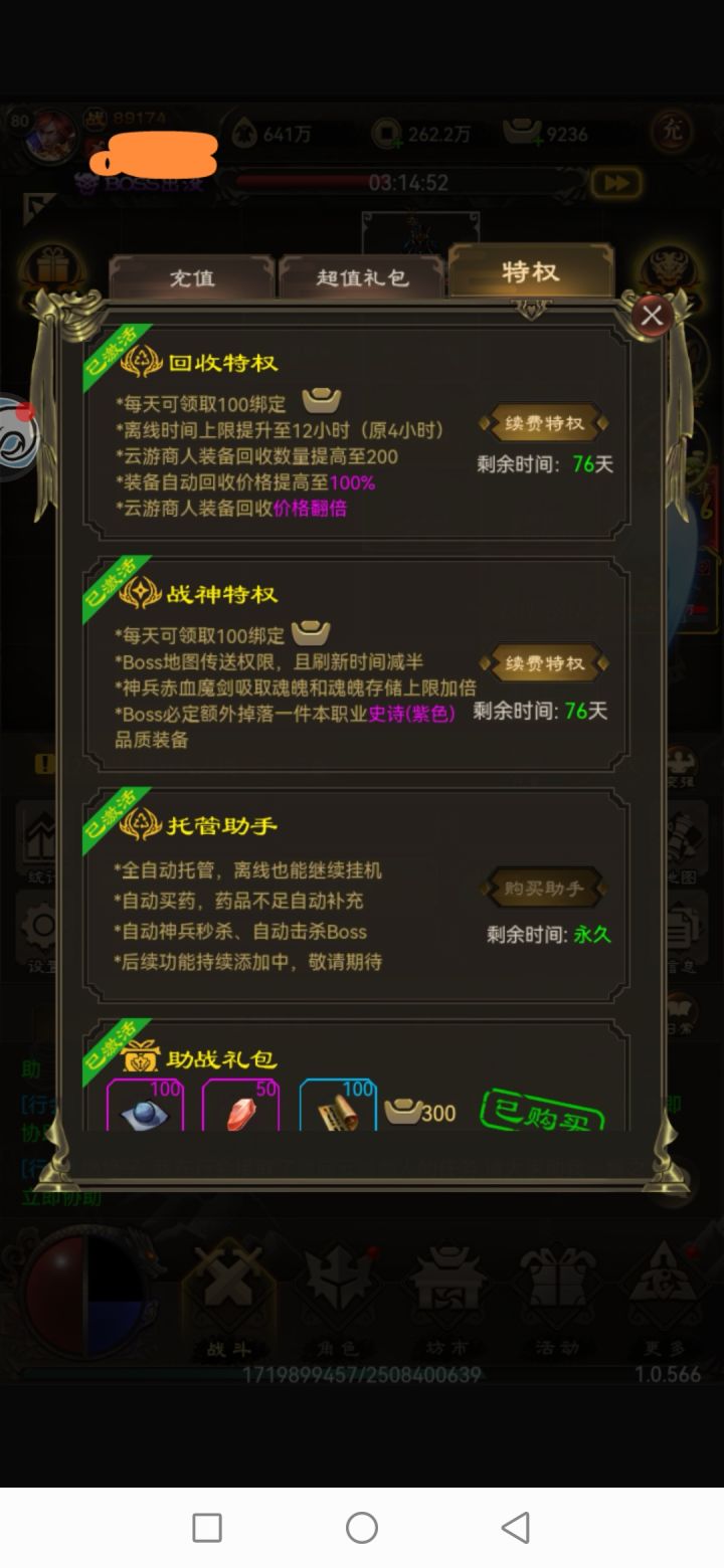 第一次写这东西,写的有点乱,凑合着看吧!玩游戏蛮,不一定要氪金,不过想玩的舒服一点,有些东西还是需要的…特权可以每天补一点元宝,托管可以离线经验。玩的长久的基本上都上都会买个托管,毕竟离线也能刷boss还是挺香的哈。传奇套需要每天打个人boss出材料,专属属于可买可不买,不过想早点出技能的话,还是买了划算,注意,觉醒丹在商城里,没买的话是100元宝一个的打折产品,买过以后就是200一个了商店
