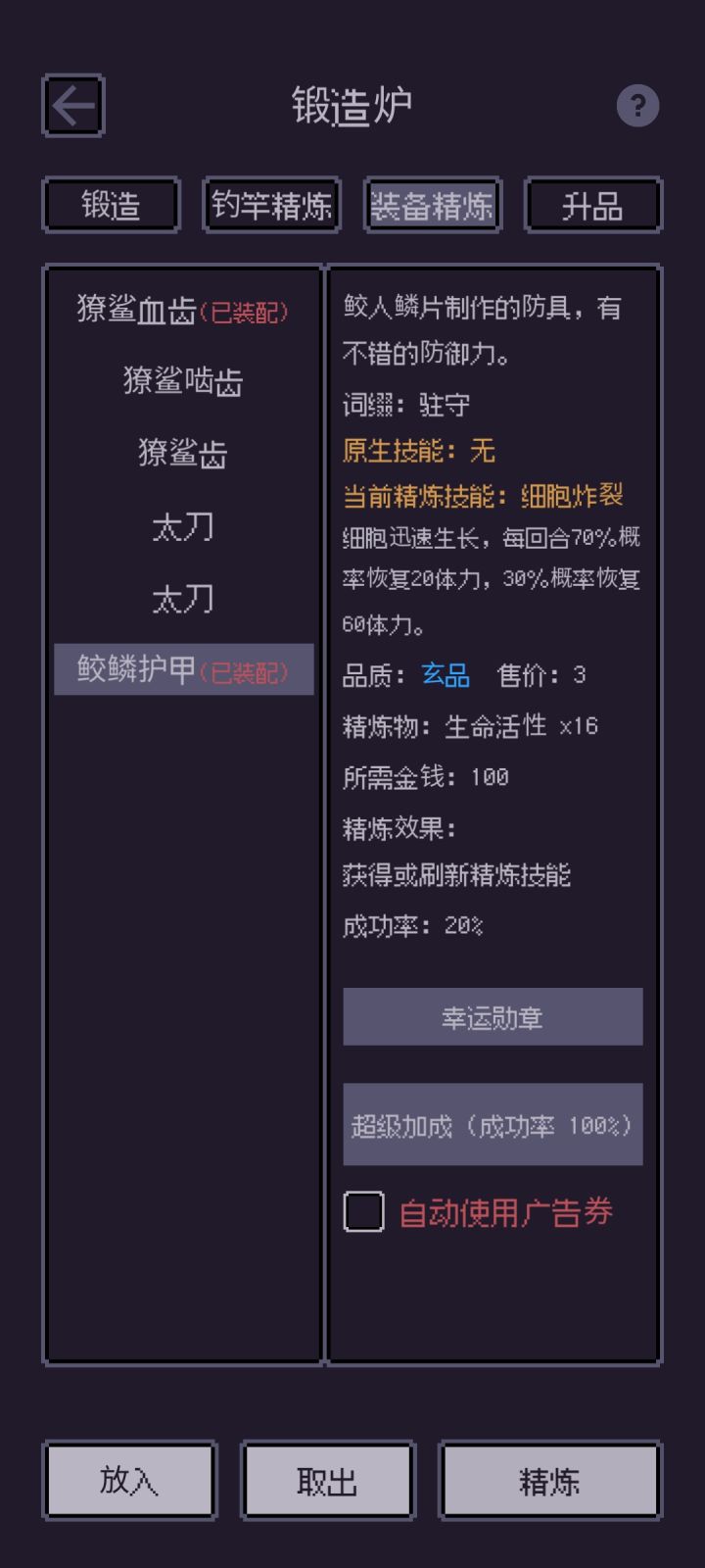 防具精炼(生命活性)细胞缓生:每回合回血10细胞增生:每回合回血15别的还没炼
