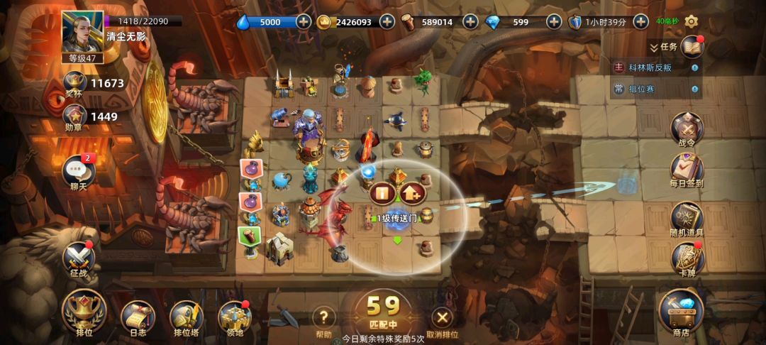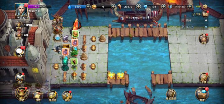 主界面1.人物头像:主角的属性信息,属性加点,背包装备碎片合成,装备升级,装备洗练功能。城邦等操作可在此进入2.奖杯:奖杯基础信息,奖杯奖励领取,奖杯排行榜,城邦排行榜,勋章排行榜可在此入口进入。(奖杯获取主要是通过排位赛,奖杯到达可以获得各种各样的奖励)3.勋章:点进去后其实是和奖杯界面一样进入勋章排行,有点鸡肋,权当显示自己的勋章数量,勋章可以用来升级领地。(其实可以跳转征战界面,毕竟征